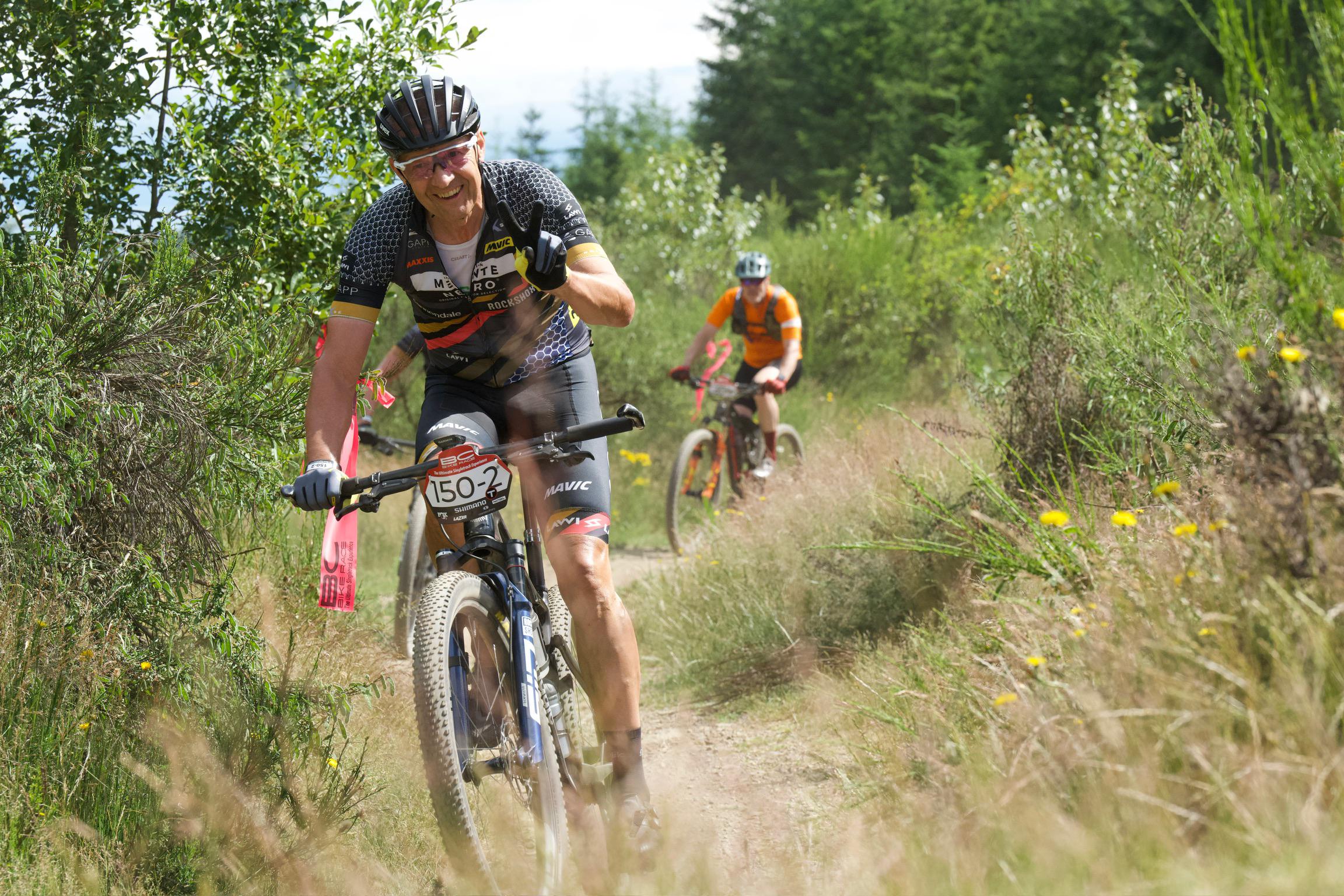 Úderem půl desáté odstartovala první z pěti vln, tentokrát by to asi ani nebylo třeba, protože prvních deset kilometrů se jelo po široké šotolinové cestě mírně do kopce. Mezi vlnami se tady nechává celkem bezvýznamná mezera tří minut, ale proto, aby se lidi na trailech nepozabíjeli, to stačí. Stáli jsem tentokrát ve třetí vlně a po startu vyrazili celkem svižně, protože tohle je spíš naše schopnost, zalehnout za řídítka a jet pravidelné tempo. Docela hodně jsme předjížděli, to člověku udělá radost, i když vlastně tam moc o nic nejde. Jsme přece chlapi a ješitný je každý z nás víc nebo míň, to je třeba si přiznat.