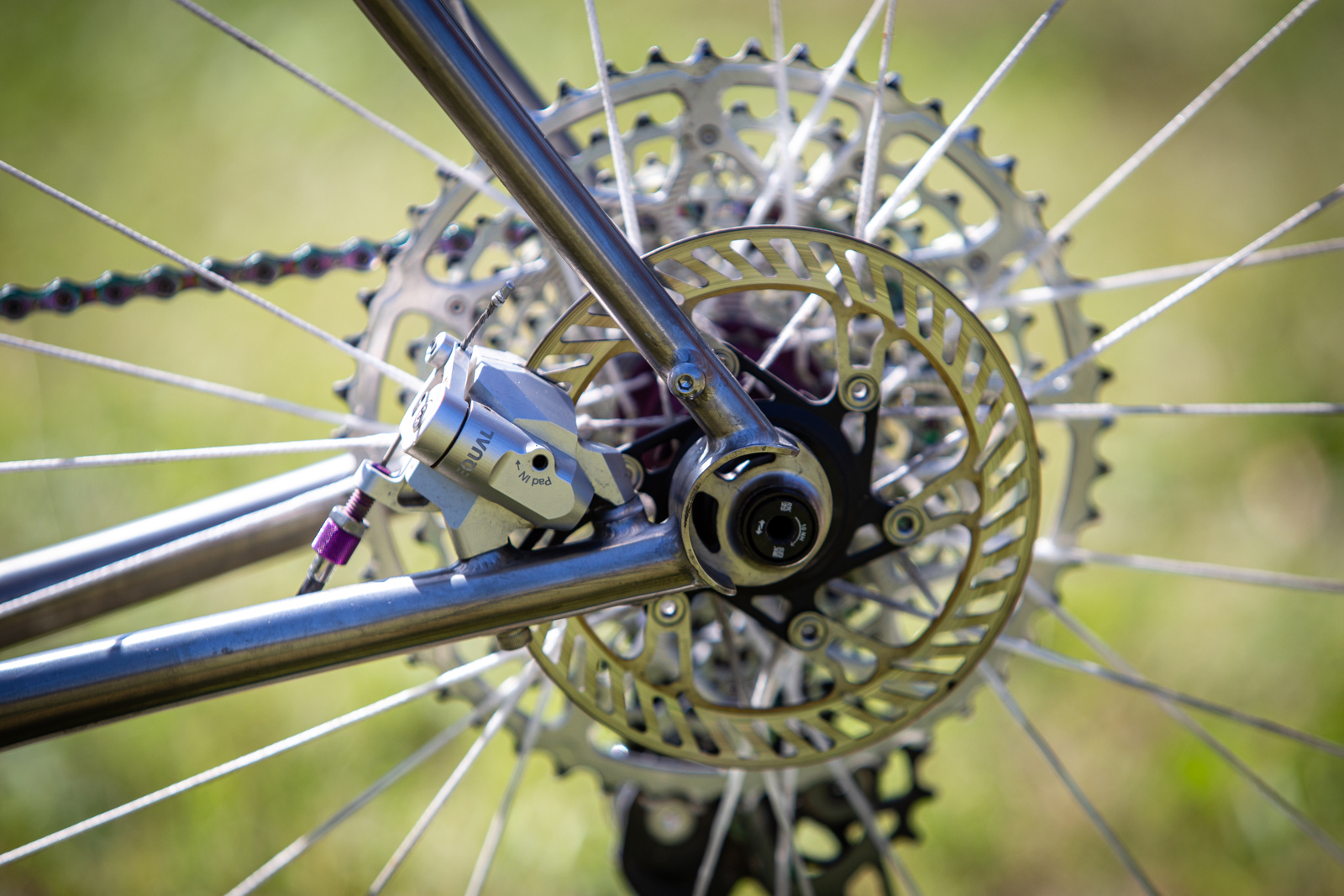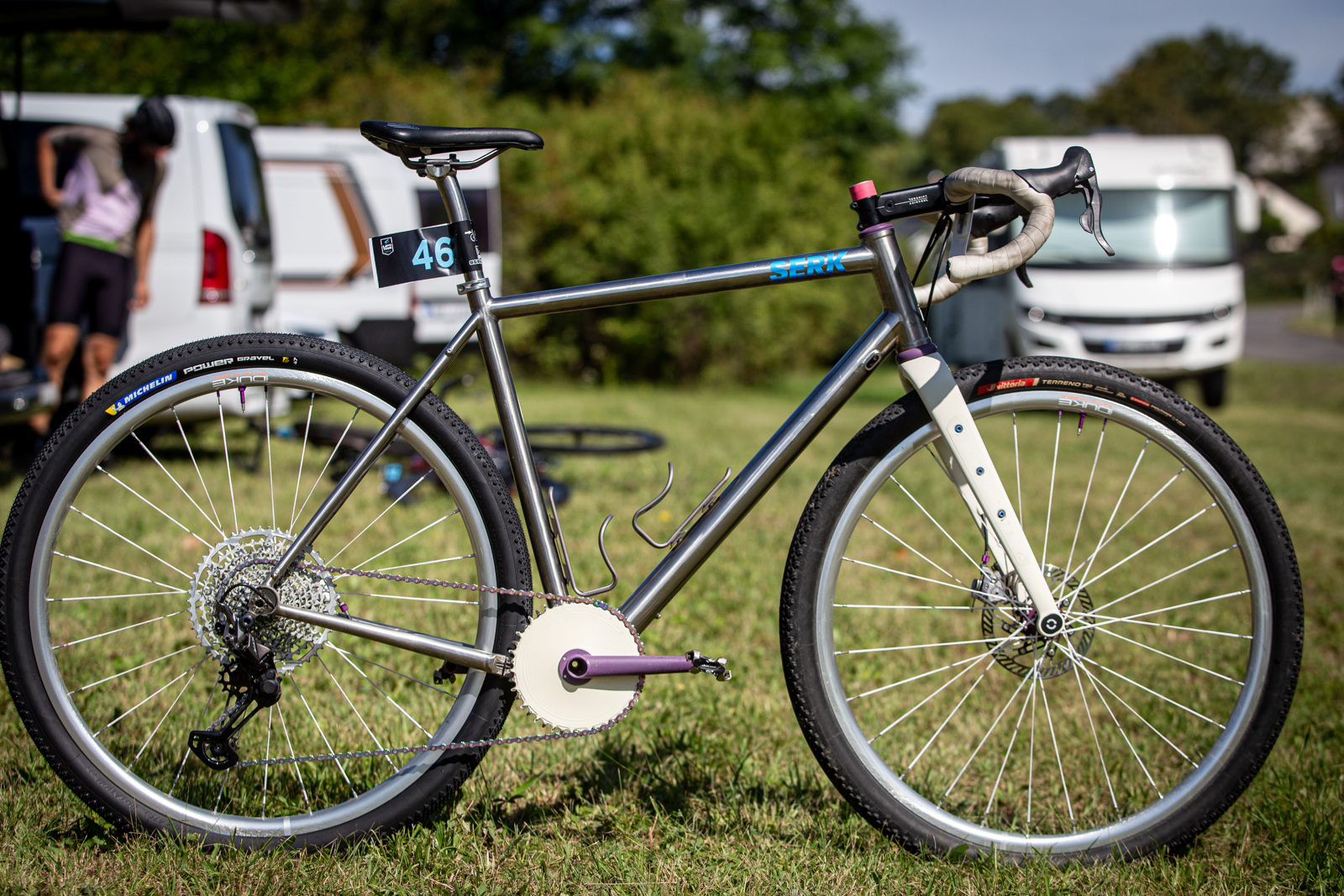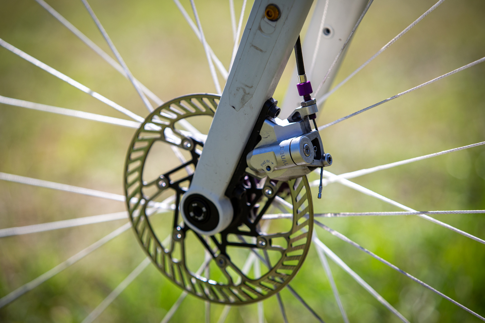 Honza dorazil na titanovém Serku s koly zapletenými z „tkaniček“ a mechanickými brzdami. „Kolo jsem si postavil podle sebe, za prvé některé značky dovážíme – např. Serk, Growtac, Cyber Cycle – a za druhé jsem si to chtěl vyzkoušet. Třeba brzdy, i když jsou mechanické, mají výjimečný brzdný výkon, super dávkování a snadnou údržbu – dělají to Japonci. Taková kola stavíme zákazníkům u nás v obchodě,“ hrdě popisuje svůj stroj, vedle kterého na trávě leží brašny a věci z putování na mistrák.