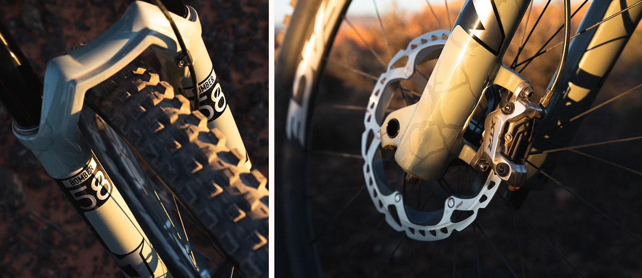 Vpředu pracovala 200mm dvoukorunková vidlice Marzocchi Bomber 58, která má stejnou výšku jako sériově osazená 170mm jednokorunková vidlice, kolem které byl tento rám původně navržen, takže nedochází k dramatické změně geometrie a tím i fungování kola.