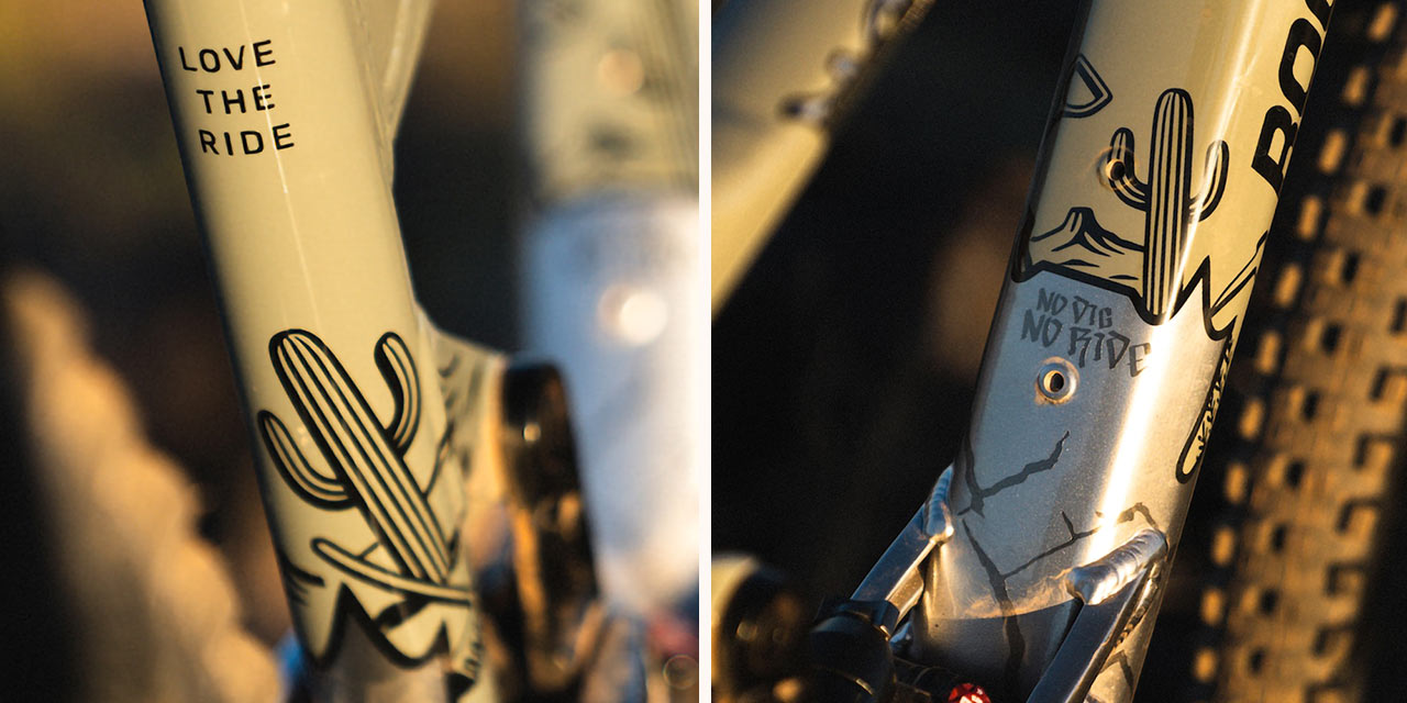 Rám byl totiž – jak asi vidíte – na zakázku nalakován Dylanem Forbesem, přičemž v rámci laku najdete hned několik jasných „zpráv“ vystihujících jeho poslání. Navíc jde o nestandardní kombinaci předního rámového trojúhelníku velikosti M a zadní stavby převzaté z velikosti S. Díky tomu je délka řetězové vzpěry kratší (430 mm), což biku podle Haydena pomáhá lépe ovládat bike ve skocích a zejména na jejich odrazech.