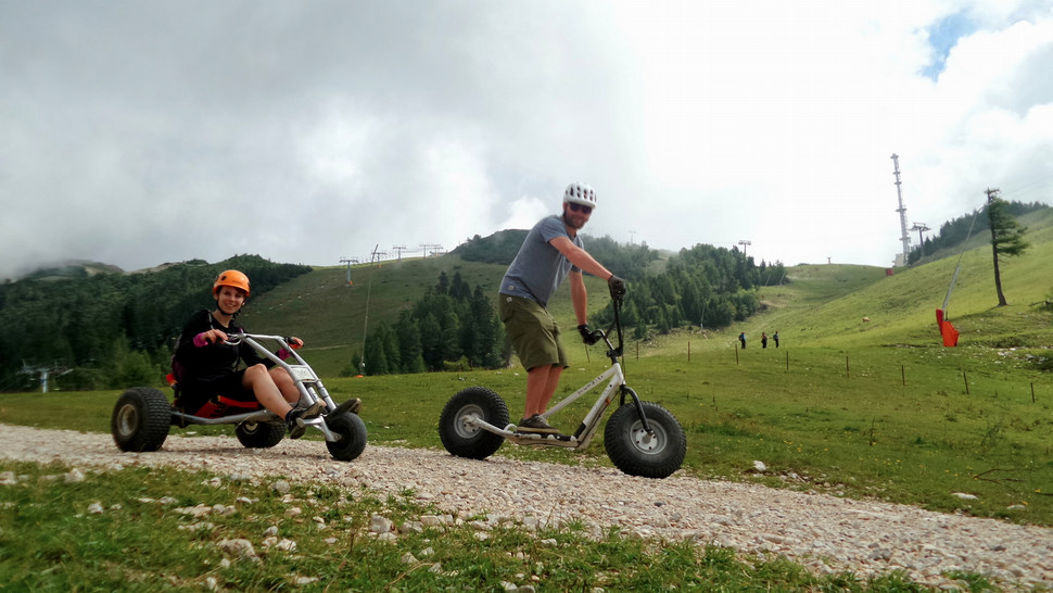 Když ne kolo, vyzkoušejte káry a koloběžky. I když to už pro nás není nic nového, narazili jsme tu zas na jiný typ trati. Zatímco ve Špindlu jedete slalom na sjezdovce nebo v Semmeringu přímo po modré bikové trase, tady drandíte ze začátku po šotolině a pak po „velmi zpevněné“ cestě, takže to docela frčí! Dospělého vyjde jedna jízda na 5 eur, dítě do patnácti let pak na 3,50 eur.