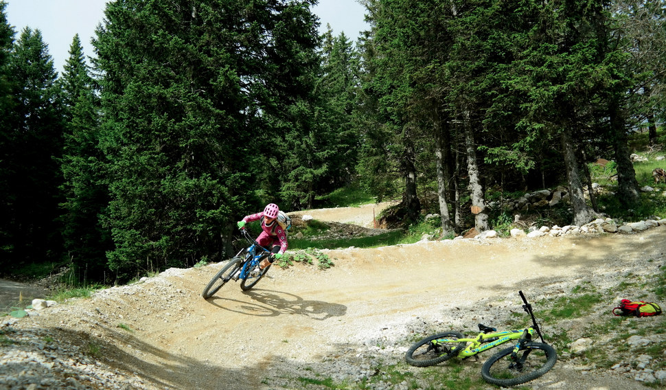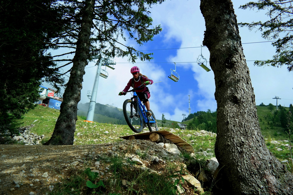Zatímco v zimě patří Krvavec mezi známá lyžařská střediska ve Slovinsku, v létě se tohle místo „převleče“ za bikepark a letní park v jednom, a do centra dění vás vyveze z města Cerklje na Gorenjskem kabinková lanovka. Zbytek se odehrává v nadmořské výšce zhruba 1600 m a bikery, turisty a jiné dobrodruhy tu vyváží čtyřsedačková lanovka. Co se týká samotného bikeparku, je Krvavec vhodný buď pro úplné začátečníky, nebo pro hodně pokročilé – osobně mi tu chybí nějaký mezistupeň. Začátečníci, děti, ale i zkušení bikeři si „pošmáknou“ na Bambino Trailu. Ten je široký, vyhlazený, skoro nikde na něm nejsou prudké pasáže, takže není potřeba ani příliš brzdit. Navíc jsme tu na něm viděli jak tatínka na pevném kole, tak jeho synka, který mu sahal zhruba do pasu a dával si to jak nic- přesvědčte se v našem videu J Pokud jste ale pokročilejší, bude se vám Bambino Trail také líbit, protože to, co třeba začátečníci přejíždějí, vy můžete klidně skákat ;-)