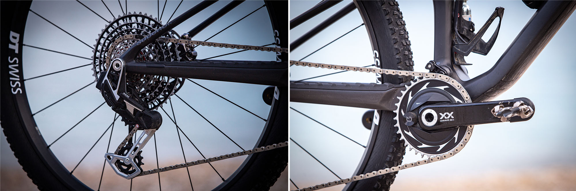 Převodové ústrojí je Sram XX, tedy řazení, kliky s převodníkem s 36 zuby, přehazovačka a kazeta. Převodník je osazen wattmeterem Quark. Filip si vybral odolnější - hliníkovou - variantu ramínka přehazovačky. Koncernová je také teleskopická sedlovka RockShox Reverb se 150mm chodem, na jehož konci je sedlo Fizik Antares R3 v šíři 141 mm. O pružení vpředu i vzadu se stará DT Swiss se 110 mm zdvihu. Od stejného výrobce jsou i zapletená kola obutá do českých plášťů Rubena. Aby bylo rozmanitosti komponentového mixu učiněno zadosti, brzdy a pedály dodává Shimano, konkrétně nejvyšší řadu XTR.