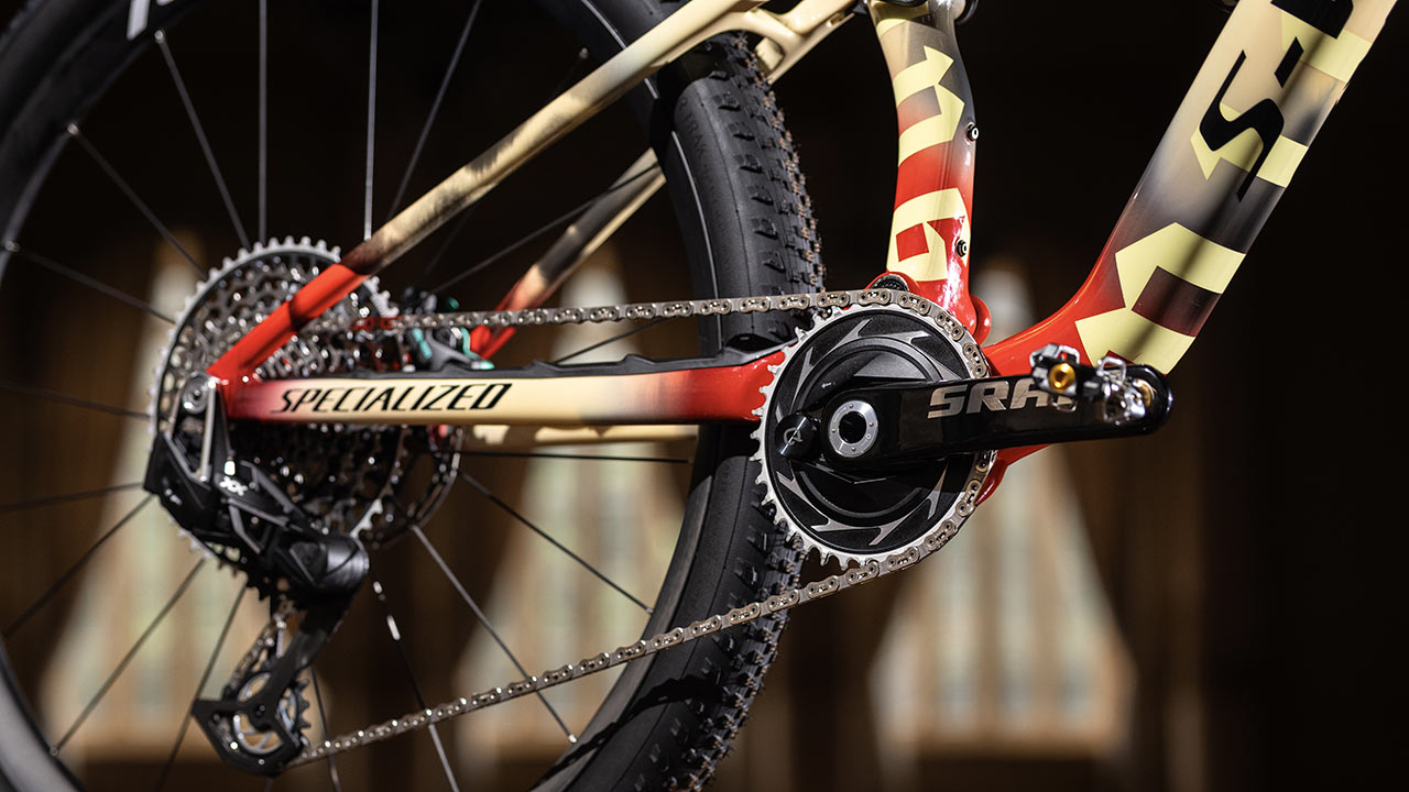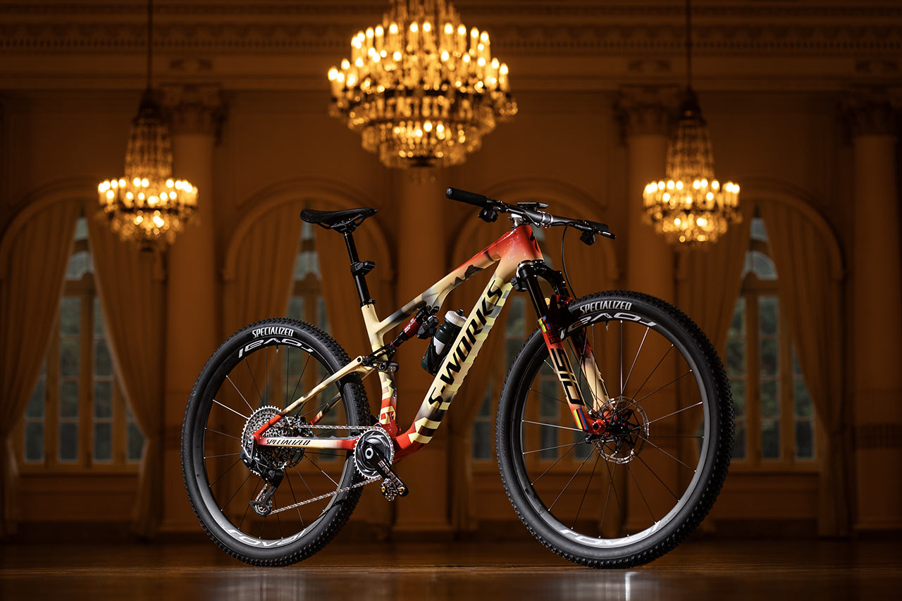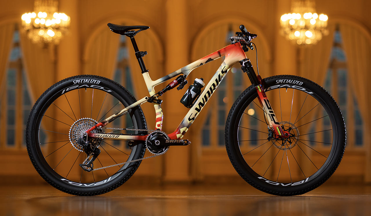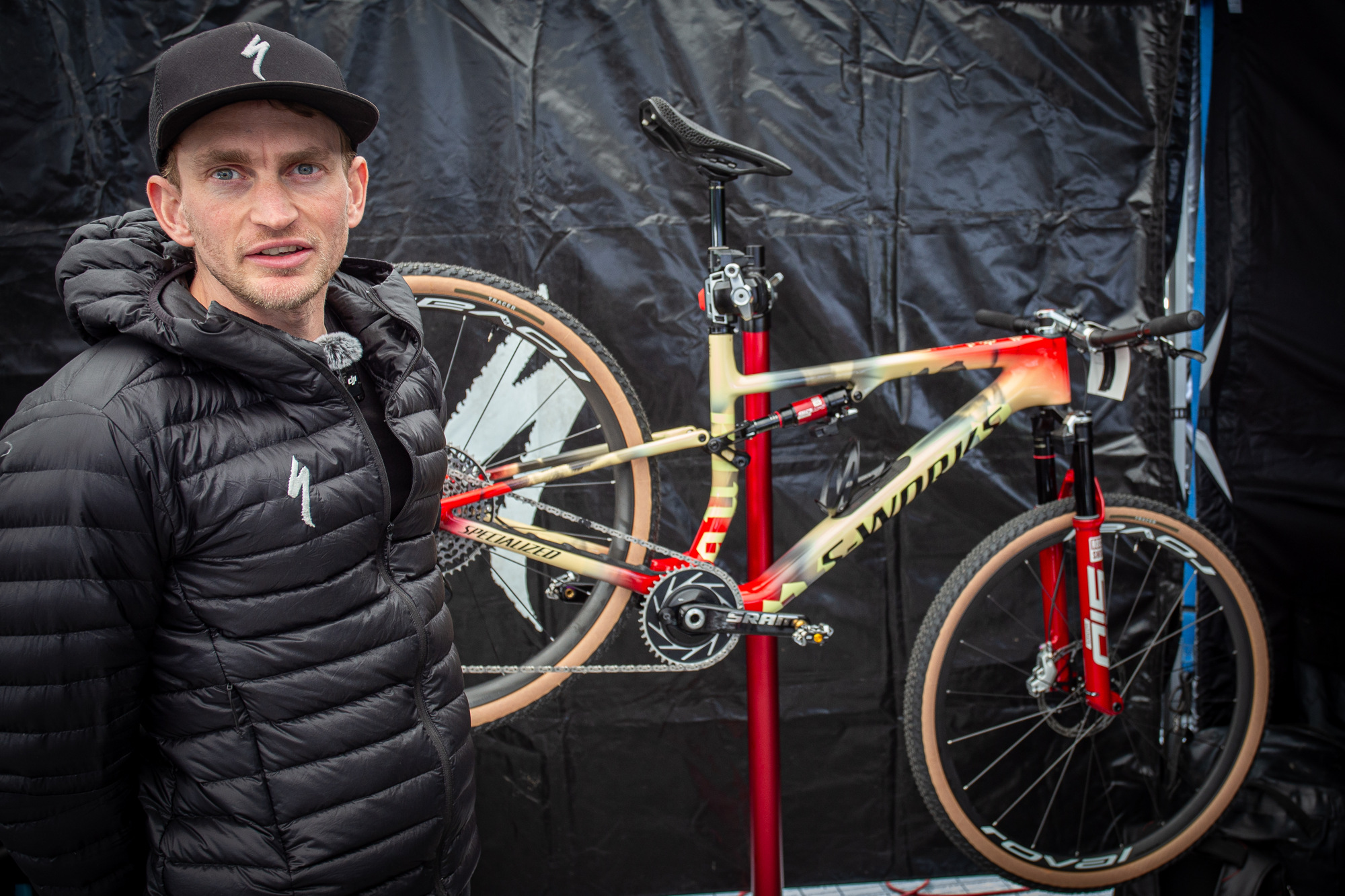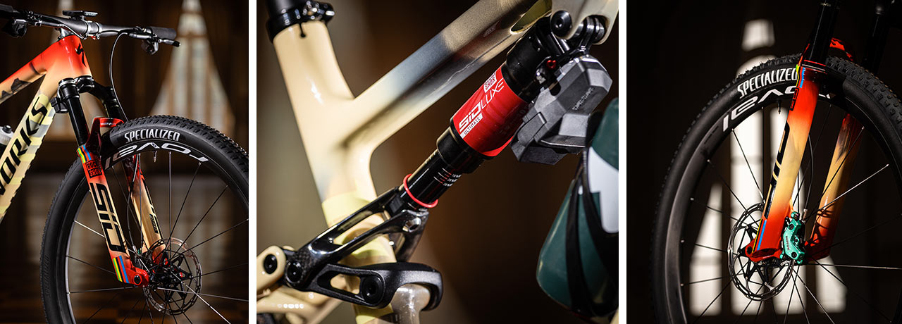 Jeho nový závodní bike je na zakázku postavený a především pak nalakovaný Specialized S-Works Epic 8 ve speciální edici pro mistra světa v Short Tracku vyfotil Michal Červený už před měsícem v brazilském Araxá. Až v Novém Městě jsme si ho ale mohli prohlédnout i my a díky jeho mechanikovi Patriku Meanovi ze Skotska, jenž ještě vloni působil ve sjezdovém týmu Canyon.
