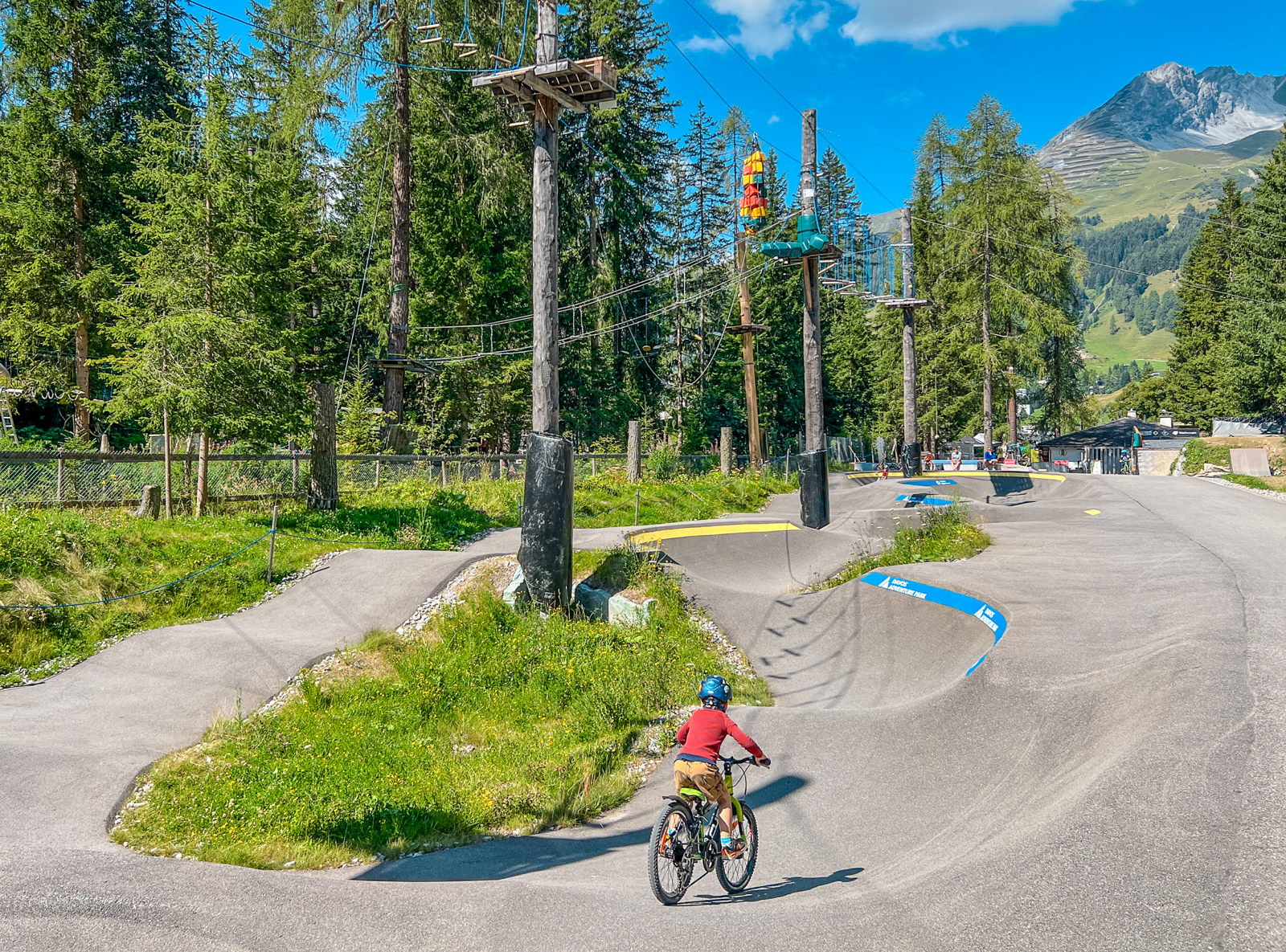 Takovým unikátním místem v Davosu je Adventure park na kraji města, který sdružuje milovníky adrenalinu i rodiny s dětmi. Na jednom místě totiž najdete dirtové skoky stavěné do výšky, které ocení hlavně milovníci slopestylu, zároveň se tu hned vedle skví pěkně propracovaný pumptrack s nejrůznějšími variantami projetí a v době naší návštěvy šlo hlavně o rajón malých dětí. Ty se tu dokázaly na kole houpat sami nebo ve skupinkách, bez ničeho nebo i s batůžkem na zádech, jako by zrovna přišly ze školy.