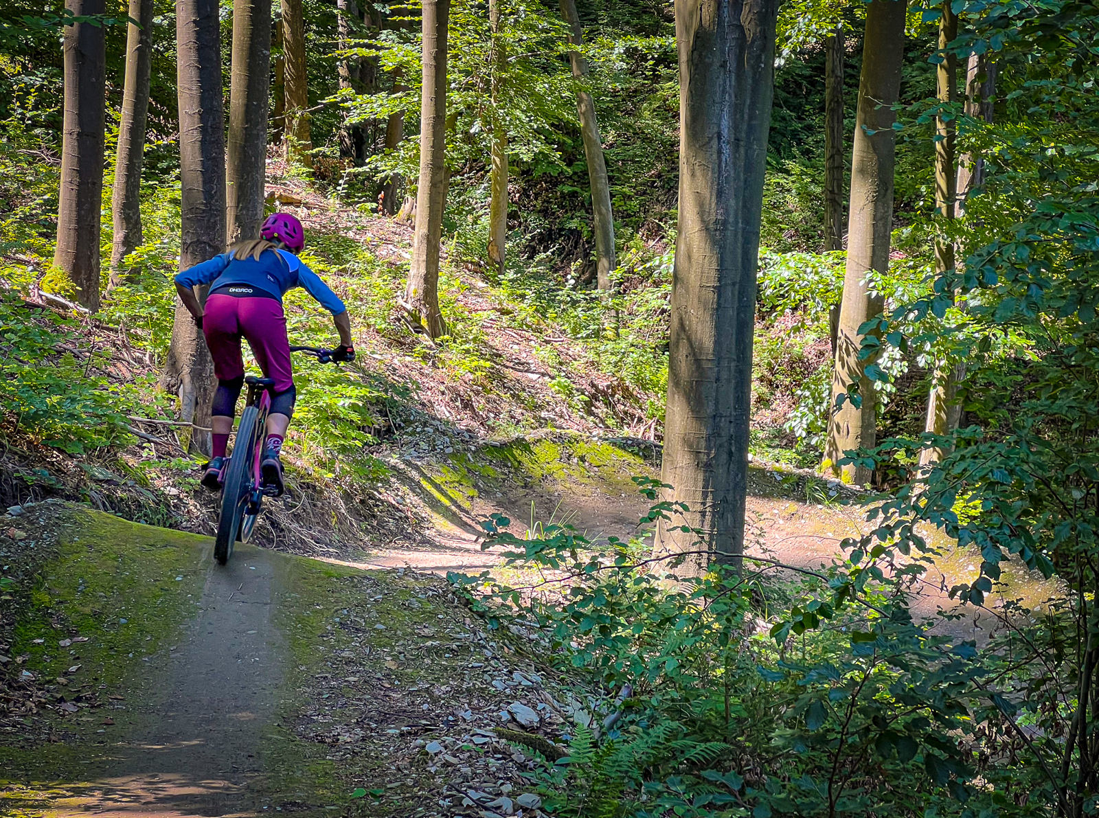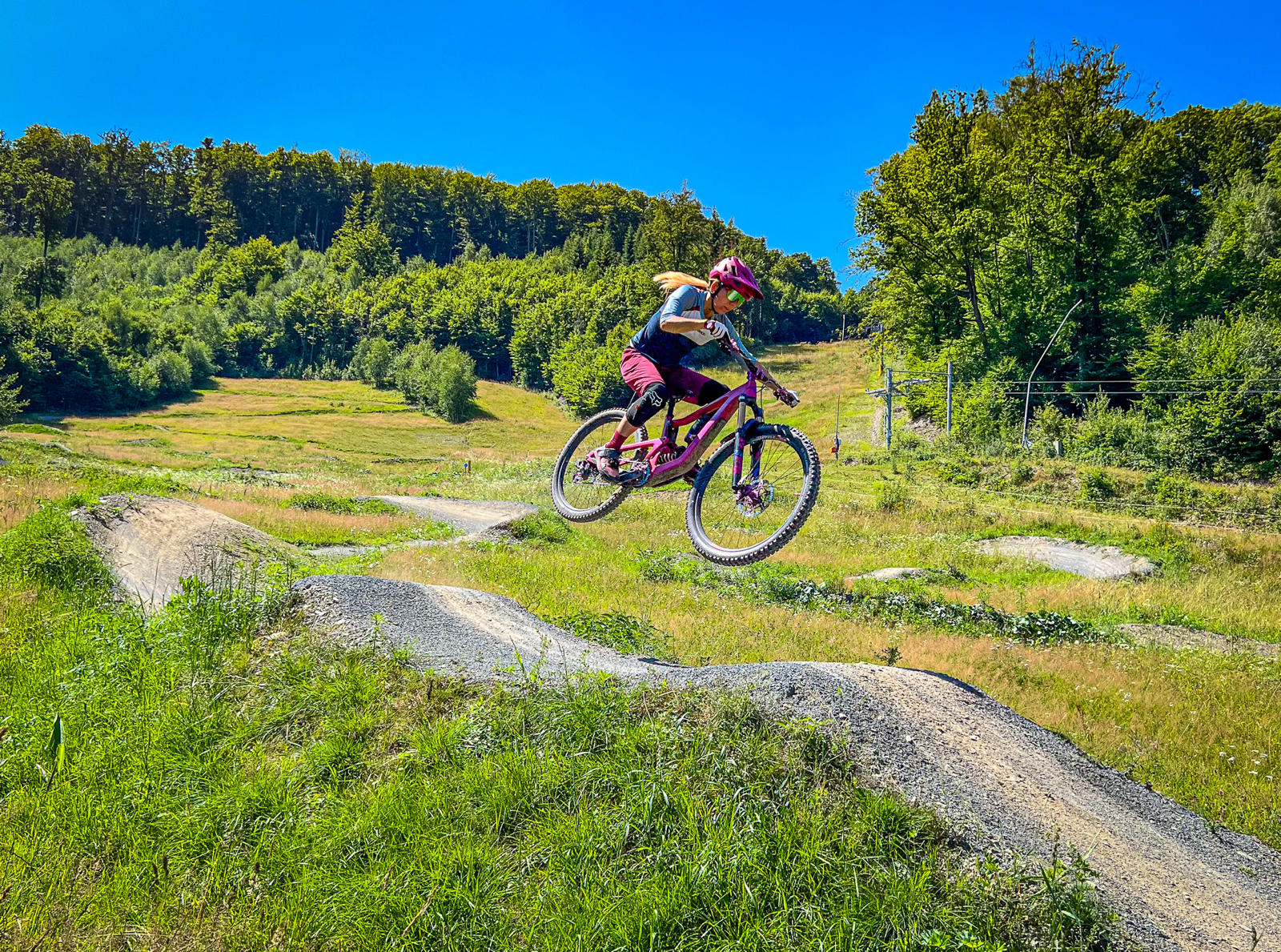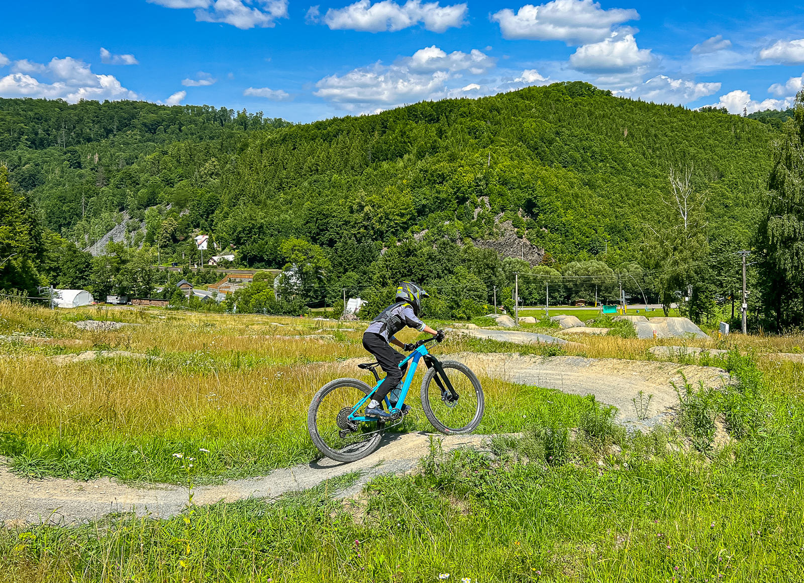 Osobně se mi tu nejvíc líbí downhillová trať, která je postavená do rychla a nabídne několik skoků, ať už v podobě přírodních hliněných dropů, gapů nebo dvojáků. Určitě je lepší se na skoky nejprve podívat, nicméně nejde o žádné extrémně velké polety, takže si myslím, že je zvládnou i průměrní bikeři. Skoky na této trati jsou vesměs postavené tak, že vám stačí rychlost získaná přirozeně na trailu, takže jízda na této trati mi přijde jako jedna z nejplynulejších.