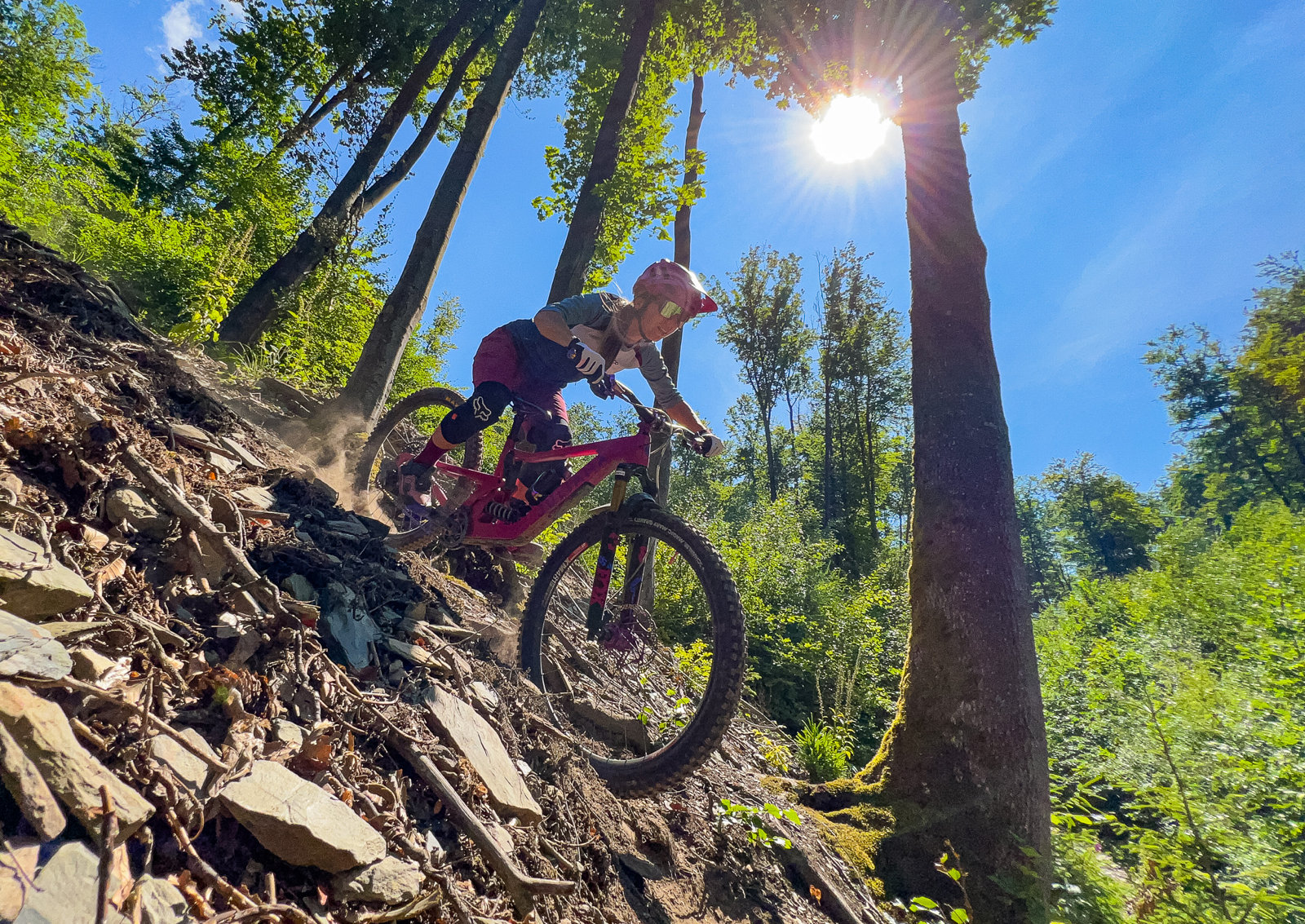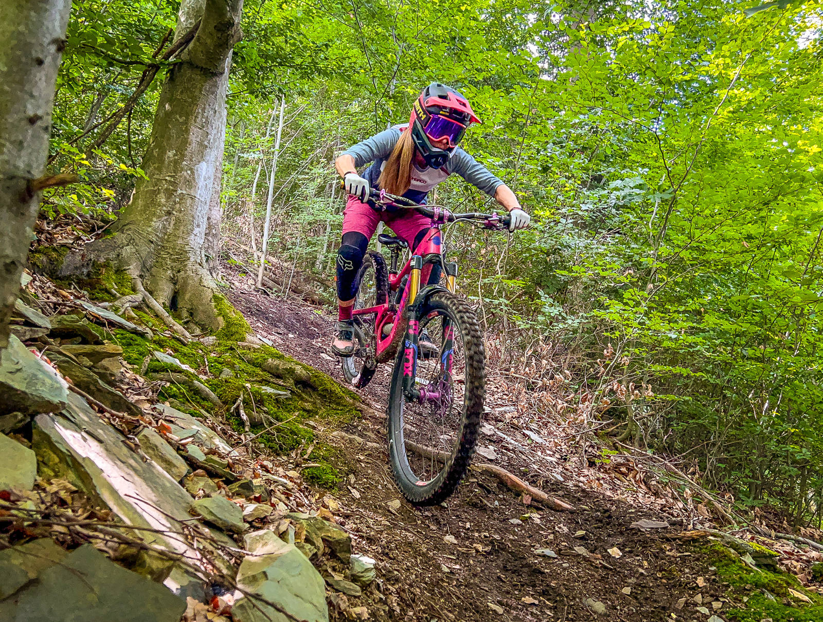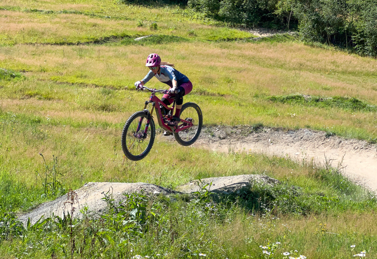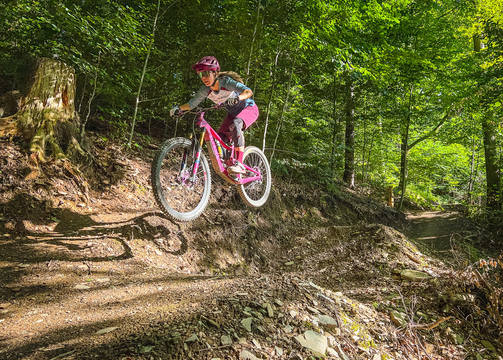 Osobně se mi tu nejvíc líbí downhillová trať, která je postavená do rychla a nabídne několik skoků, ať už v podobě přírodních hliněných dropů, gapů nebo dvojáků. Určitě je lepší se na skoky nejprve podívat, nicméně nejde o žádné extrémně velké polety, takže si myslím, že je zvládnou i průměrní bikeři. Skoky na této trati jsou vesměs postavené tak, že vám stačí rychlost získaná přirozeně na trailu, takže jízda na této trati mi přijde jako jedna z nejplynulejších.