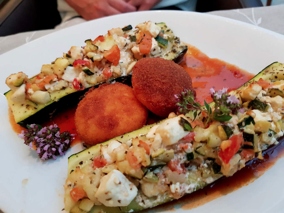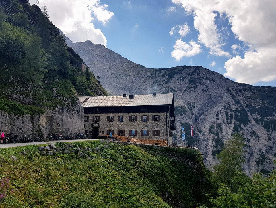 Karwendelhütte kromě typické horské kuchyně servíruje samozřejmě i výhled z terasy do údolí. Z jídel je pak k mání například jelení guláš, boloňské špagety nebo míchaný salát. Zpátky už vede cesta krom pár nevýrazných stoupání převážně z kopce, přesto doporučujeme dobít si na Karwendelhütte baterku na vašem e-kole.
