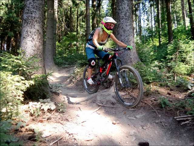 Budeme-li pokračovat dál v rytmu hravých singletracků, přejděme na druhou stranu bikeparku, kde se nachází dvě červené tratě a technickou náročností jsou si tedy podobné. Na oba traily se dostanete buď spodním výjezdem z parcouru nebo přejezdem z tratí Roll&Rock Downhill či Jumpline rovněž pod parcourem. Trať Bärwurz-Trail, která lemuje sjezdovku, představovala technický lesní úsek, kde bylo minimum umělých překážek, až na jeden dřevěný drop. Trať nebyla nijak extra náročná, ale ani tolik zábavná, takže u nás nasbírala nejméně bodů.