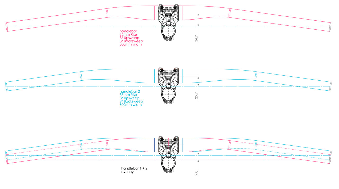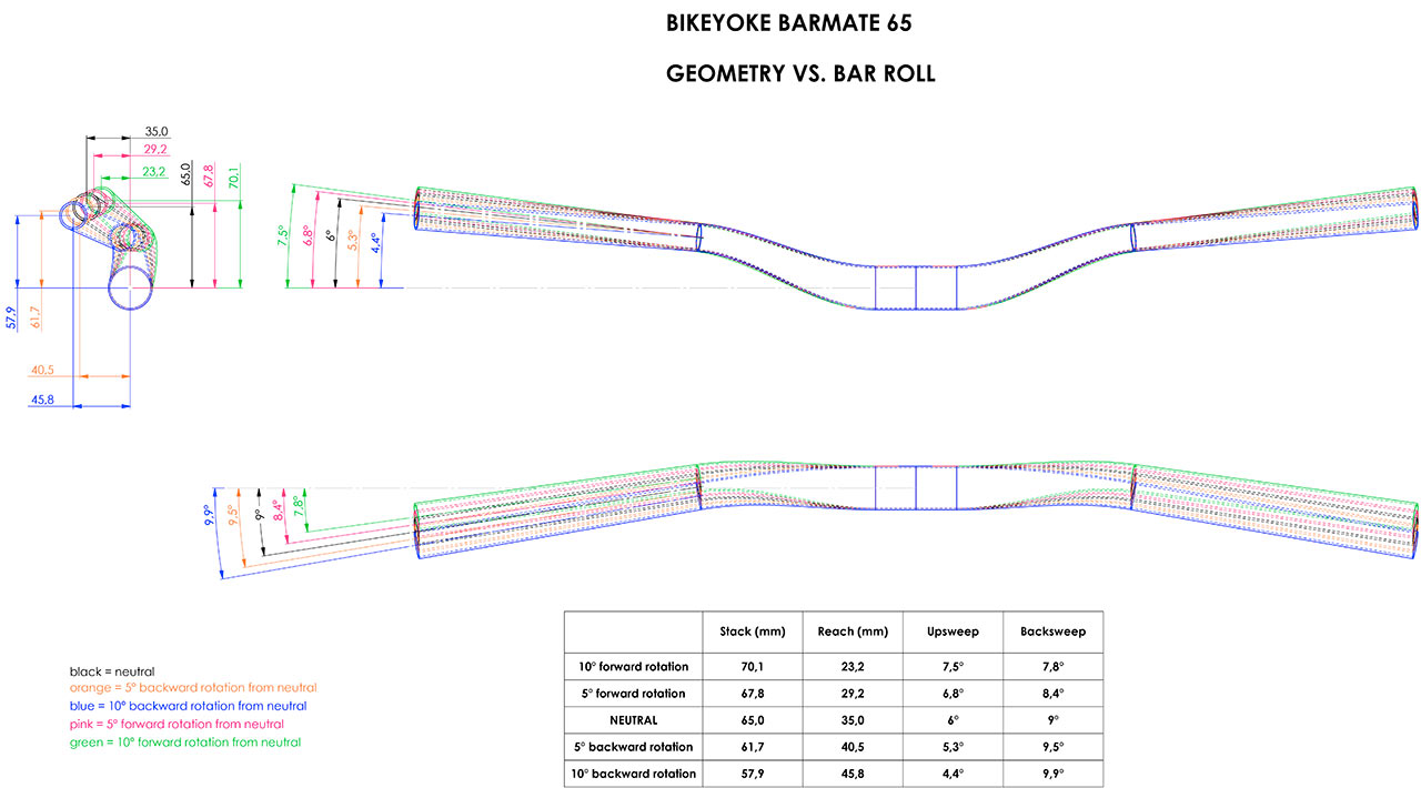 Jak již jsem zmínil, BikeYoke zavádí nový způsob označování rozměrů řídítek Barmate – místo tradičního "rise" používá pojem "stack", který známe z tabulek rámových geometrií.