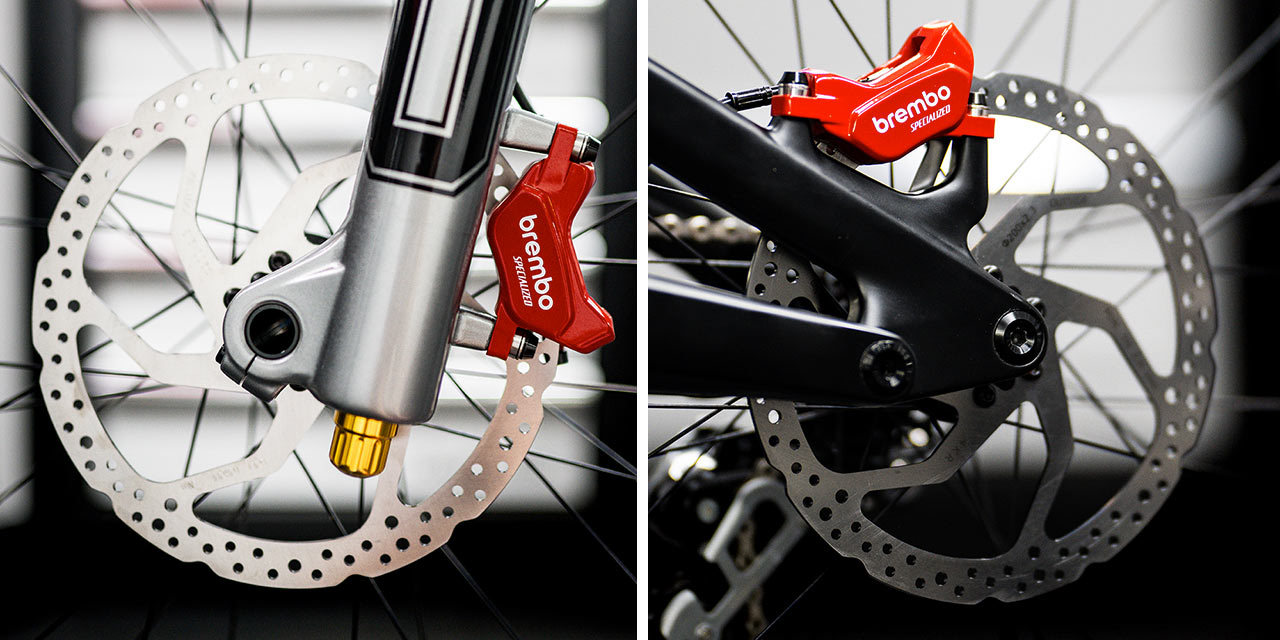 Nové čtyřpístové brzdy nesou výrazné bílé logo Brembo-Specialized a zaujmou nejen barvou, ale i technickým řešením. Brzdová páka má elegantní tvar s hadicí vedenou paralelně k řídítkům – podobně jako Stealth řešení od Sramu. Ovládací prvky zahrnují vroubkované kolečko, stavěcí šroub pro nastavení vzdálenosti páky od gripu a další seřizovací mechanismus umístěný v prostoru mezi pákou a řídítky. Úplnou novinkou jsou i brzdové kotouče o síle 2,3 mm.