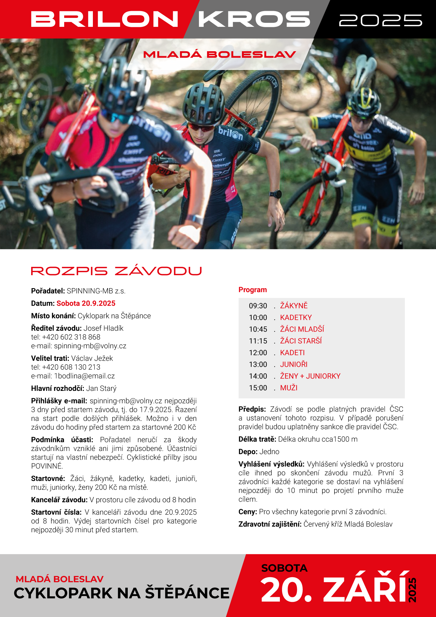 Tradiční otvírák cyklokrosové sezóny - Brilonkros v Mladé Boleslavi, se pojede v sobotu 20. září v Mladé Boleslavi v lesoparku Štěpánka. Program odstartuje již v 9:30 kategorií žákyň a postupně se vystřídají ročníky kadetů, juniorů až po elitu.
