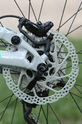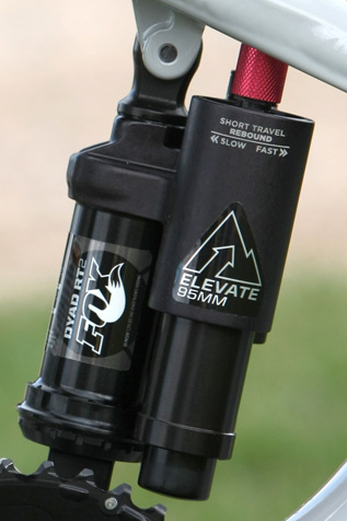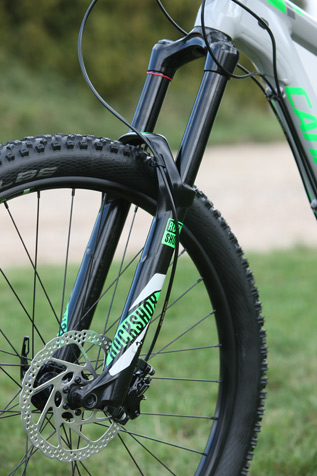 O odpružení už řeč krátce byla. Vpředu najdeme základní Pike RC Solo Air se 160 mm zdvihu a 51 mm offsetem, vzadu pak na zakázku zkonstruovaný Fox DYAD RT2 tlumič, který lze přepínat mezi 160 a 95mm zdvihem páčkou na řídítkách.