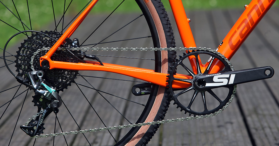 Slate je originál jak co se rámu týká, tak co do osazení. Pokud ho totiž máme stále řadit ještě mezi silniční kola, podle použitých řídítek se spodním úchopem, při pohledu do tabulky naše pochybnosti o tomto určení dostávají zabrat ještě víc. Jednopřevodníková sada Sram Force 1 ještě není pro tento typ kol žádnou velkou zvláštností. Svítí zde specifické Cannondale Si kliky s brilantně frézovaným převodníkem se 44 zuby, který spolu s jedenáctipastorkovou kazetou 11-42z. nabídne opravdu velký rozsah převodů, postačující jak na rychlou jízdu, tak i pomalejší výstupy ve větším terénu.