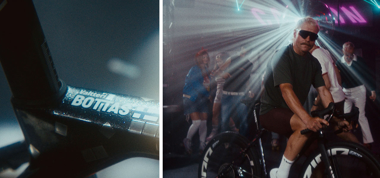 Canyon a Bottas se rozhodli tento retro motiv pojmout s nadsázkou a humorem. Kampaň spuštěná na Instagramu Canyon ukazuje slavného Fina, jak na svém kole předvádí taneční kroky pod světly reflektorů, které zvýrazňují zrcadlové detaily rámu. Designér Lukas Beck navíc do ikonického tvaru hlavové trubky Canyon zakomponoval nenápadnou poctu v podobě siluety Bottasova charakteristického kníru.