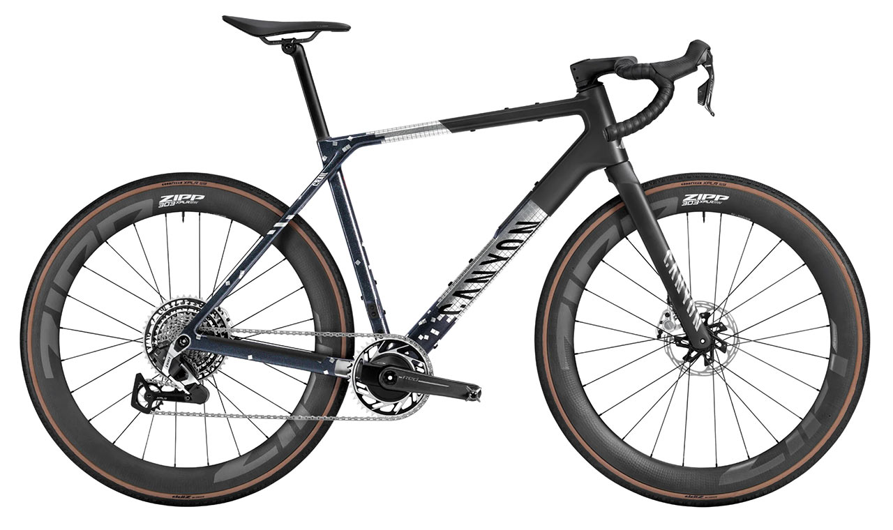 Pod originálním lakováním se skrývá nejvyšší model gravelové řady Canyon – Grail CFR. Aerodynamicky optimalizovaný rám je konstruován pro rychlost i pohodlí na dlouhých trasách, přičemž sedlové vzpěry napojené na horní trubku účinně pohlcují vibrace a přispívají ke komfortu jezdce. Praktickým prvkem je integrovaný úložný prostor LOAD v dolní rámové trubce, kam se vejde nářadí, náhradní duše nebo třeba drobný suvenýr z cesty.