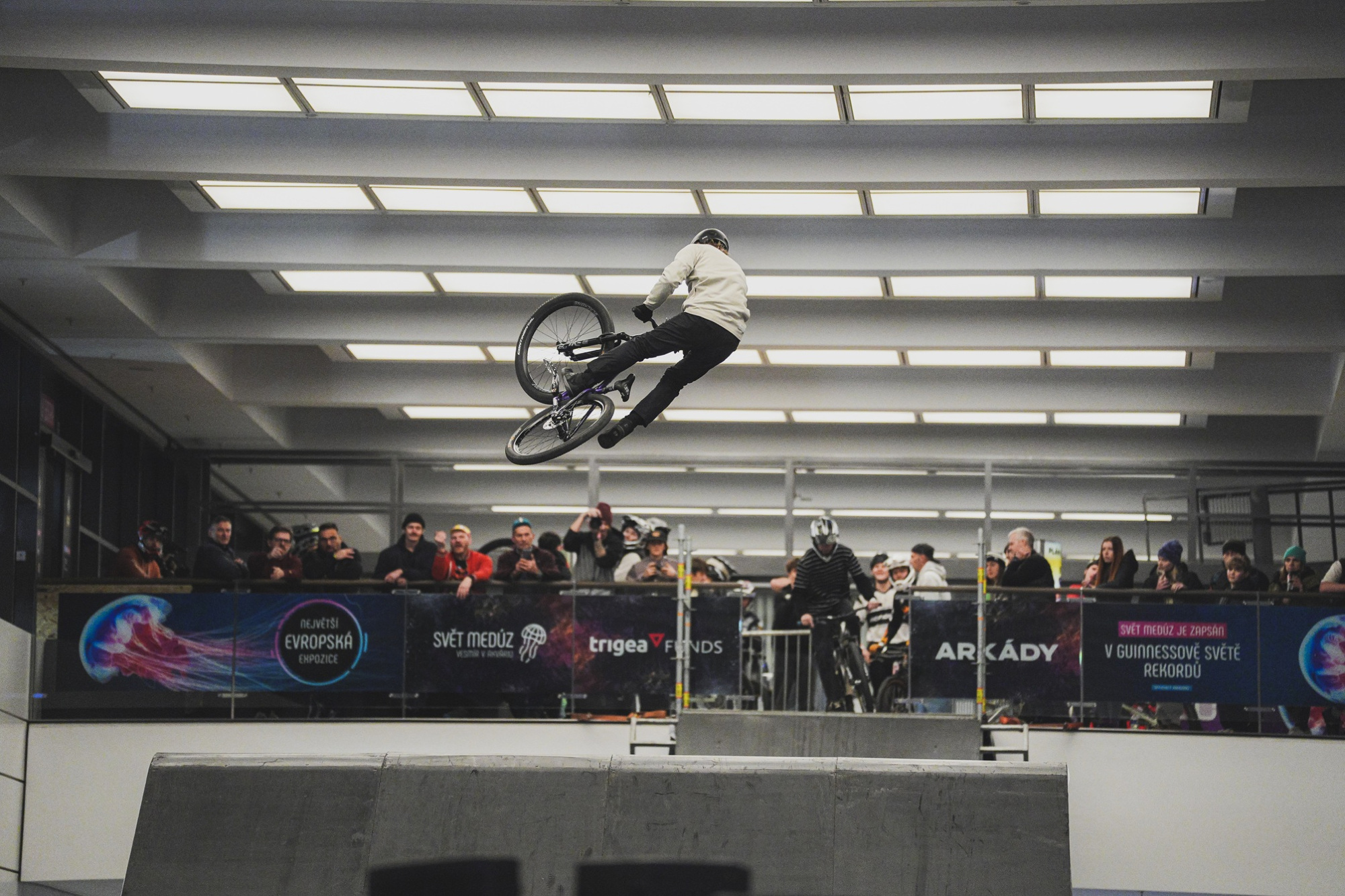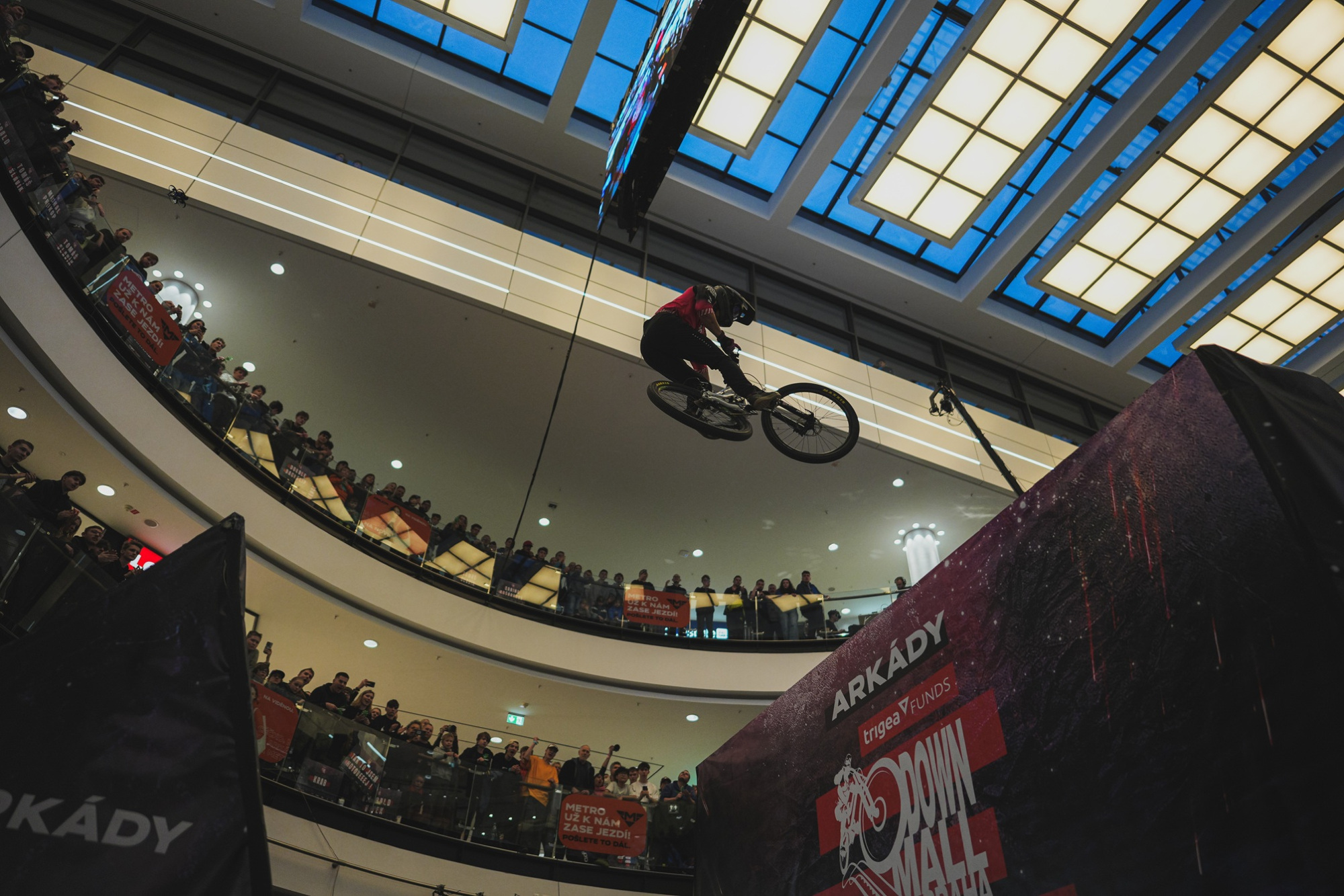 Pražské obchodní centrum Arkády Pankrác se v sobotu proměnilo v adrenalinovou arénu. Závod Arkády Trigea DownMall 2026 přinesl strhující podívanou plnou rychlosti, skoků a extrémních pasáží přímo mezi eskalátory a obchody. Hlavní závod ovládl špičkový český endurista Jakub Pivnička, zatímco ve slopestyle soutěži kraloval Lucas Huppert ze Švýcarska.