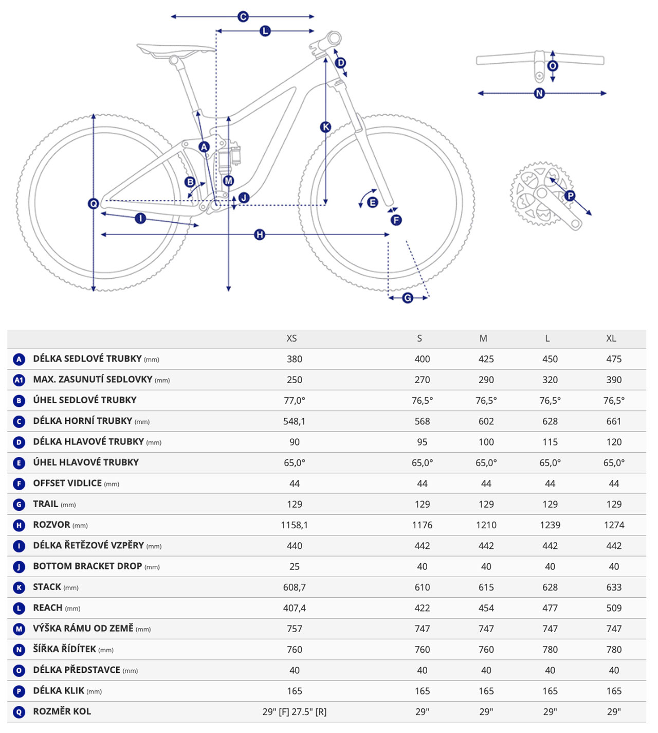 Moderní trail geometrie posouvá jízdní vlastnosti směrem k větší stabilitě. Položenější hlavový úhel zvyšuje jistotu v prudkých sjezdech a rozbitých pasážích, zatímco vyšší stack pomáhá udržet jezdce více „uvnitř kola“, což se pozitivně projevuje v kontrole v náročném terénu.