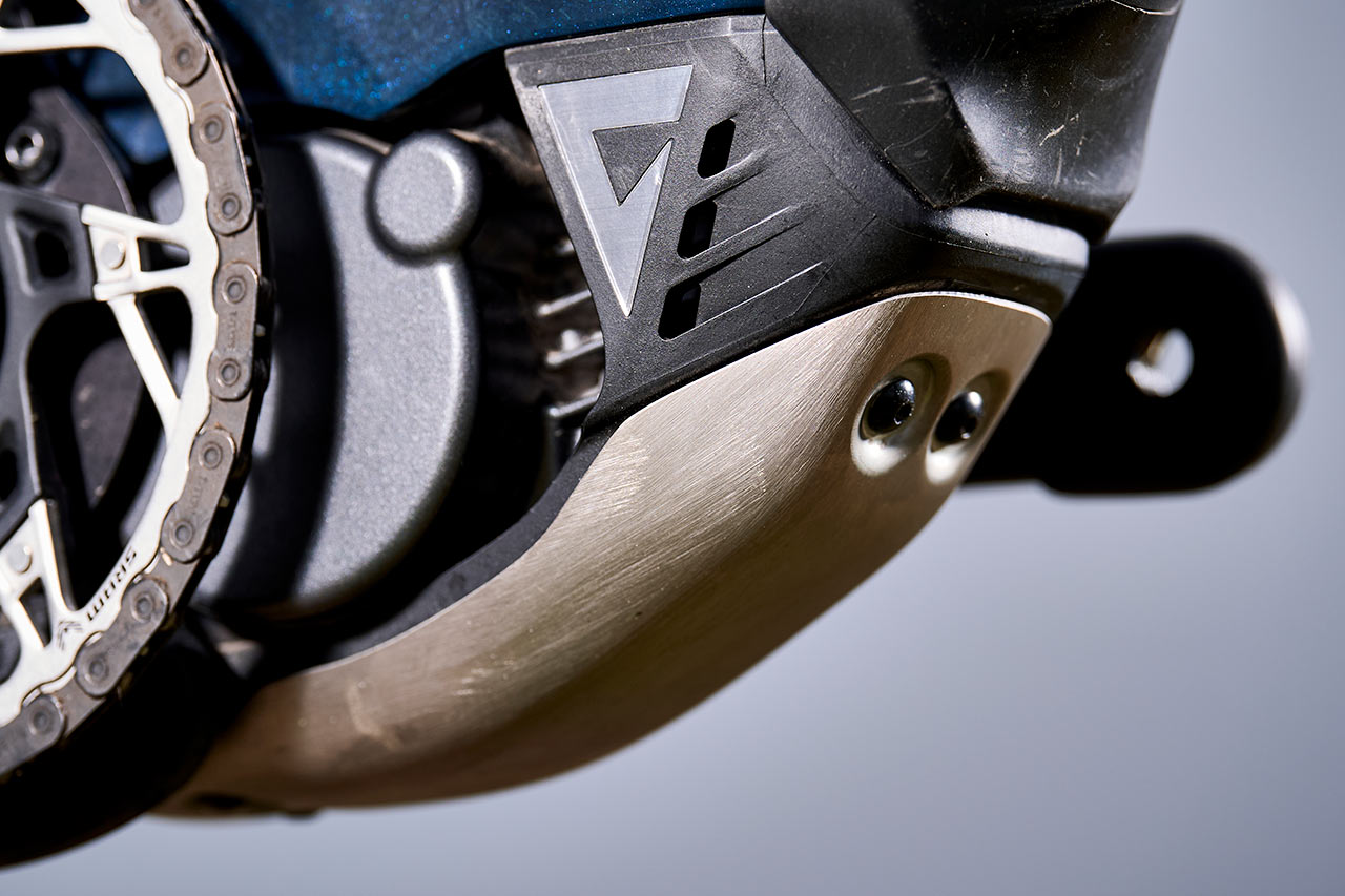 Motor pak kryje titanový spodní skid plate, který je dvakrát pevnější než hliník, s nižším třením při kontaktu s překážkou. O ochranu řetězu a převodníku se stará unikátní aktivní bashguard od MRP. Výsledkem je e-bike, který se nebojí tvrdého zacházení ani náročného enduro nasazení.