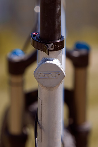 Hydroforming duralových trubek z materiálu Alu 6061-T6 zajišťuje nejenom dostatečnou tuhost a pevnost, ale rovněž také nízkou hmotnost celého rámového setu. Sympatický je pak také typický GT detail v místě, kde zploštělou horní rámovou trubkou prochází trubka sedlová ukončená záslepkou s logem GT.