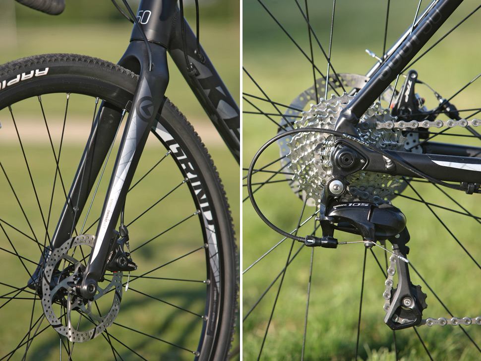 Pravda, stopětková sada je u klik nahrazena mimosadovými kompakty RS510 a osazeny jsou pouze mechanické kotoučovky od Tektra, takže mohly být zachovány klasické mechanické dualy 105 a ty jsou výrazně dostupnější než jejich hydraulické kolegyně, nicméně všechno ostatní už je klasická shimaňácká stopětka. Převody jsou zde pochopitelně alespoň decentně kompaktní, a to vpředu dvouplacka 50/34 a vzadu jedenáctipastorková kazeta 11-32z.