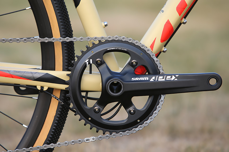 O pohon se tu totiž stará jednoplackový Sram Apex s kovanými klikami osazenými jediným převodníkem se 44 zuby. K němu je pak vzadu doplněna jedenáctková kazeta 11-42z.