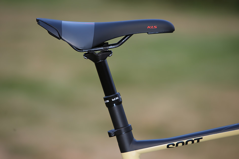 Ale abych nezapomněl na druhou nejzásadnější věc, kterou se novinka liší od letošních Sootů, mrkněte na sedlovku. Ano, Kellys na vrcholný model svého gravelbiku osazuje v sérii teleskopickou sedlovku, Jde o speciální nízkozdvihový model od Kind Shocku s průměrem 30,9 mm a zdvihem pouhých 70 mm, ale to na takovýto typ biku zcela postačuje.