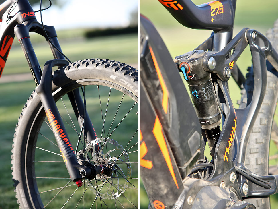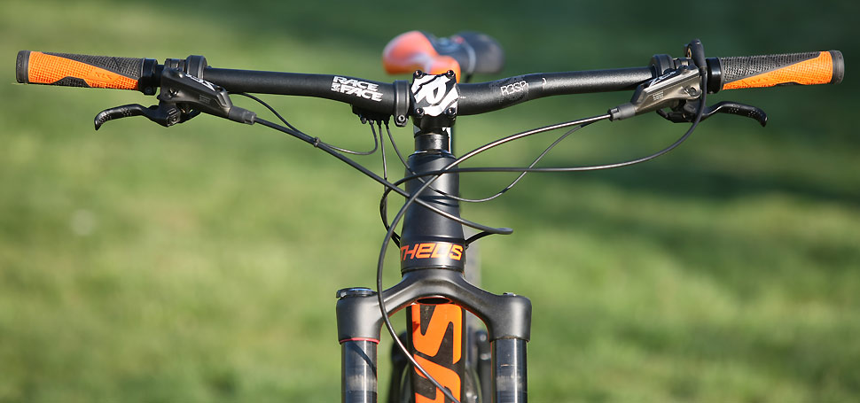 Design rámu ale jinak zcela zohledňuje předurčení obou biků. Pro kolena je dost a dost místa nad horní rámovkou a o minimalizaci ztrát při šlapání se postará zadní virtuální odpružení, u kterého najdete tlumič uložený přímo na dvojici vahadel, procházející dutou sedlovou trubkou. Ta poněkud komplikuje vnitřní vedení ovládání teleskopické sedlovky, které je v jednom případě řešeno vnějším vývodem ze spodní části sedlovky v druhým pak vnitřním vedením vyústěným v těsné blízkosti pístnice tlumiče.