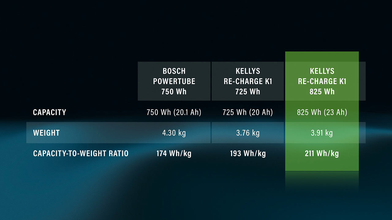 Kellys je známý tím, že ve svých elektrokolech používá baterie německé firmy BMZ, která patří mezi lídry v oblasti vývoje a výroby bateriových systémů pro elektrokola. Ta se už v minulosti mohla pochlubit velmi dobrým poměrem hmotnosti a kapacity (capacity to weight ratio) – například baterie s kapacitou 825 Wh (23 Ah) váží jen 3,91 kg, což znamená poměr 211 Wh na kilogram hmotnosti.