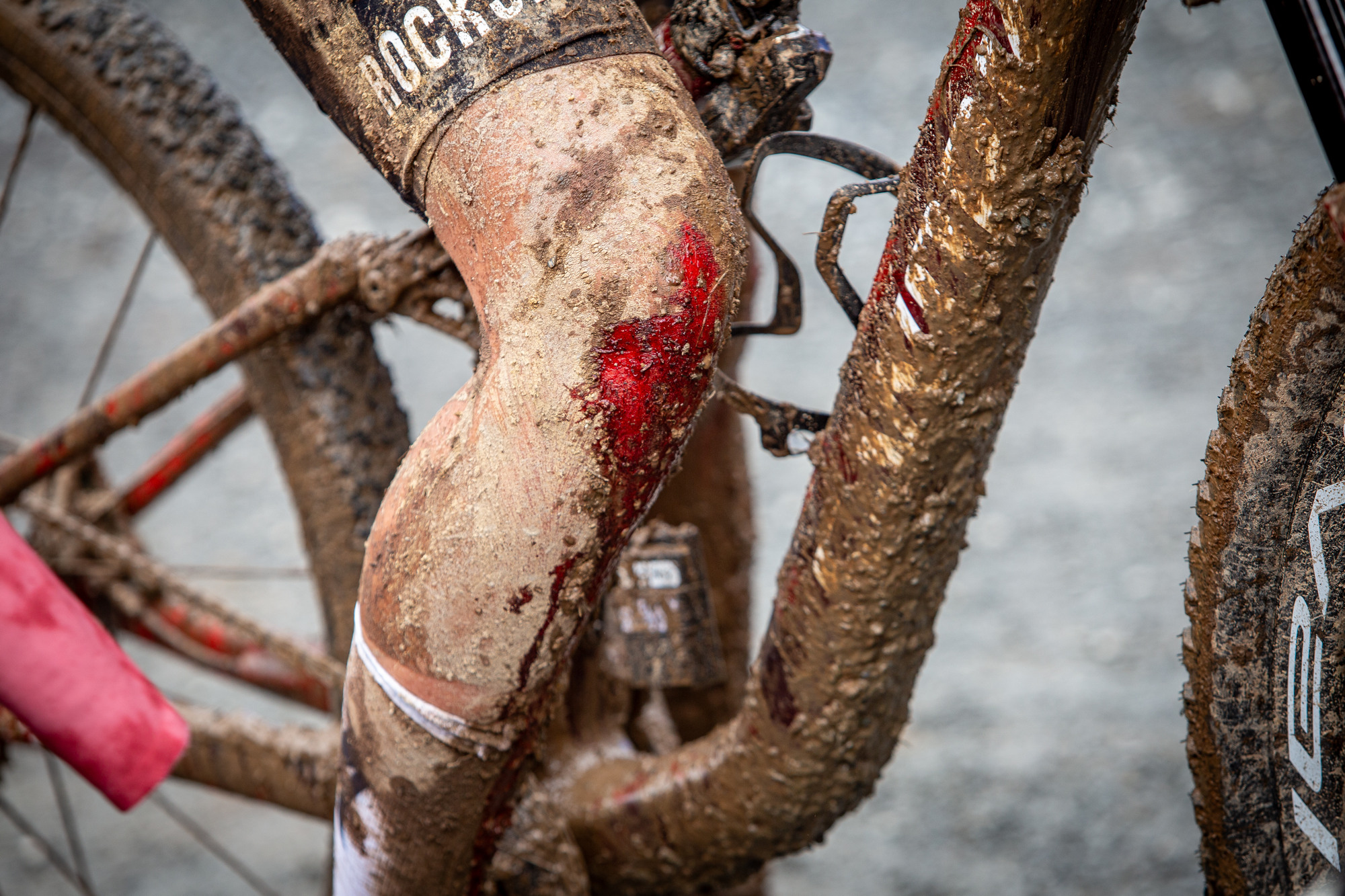 Pádů a minel bylo ohromné množství. Na blátě to ani jinak nejde. S takovým kolenem do cíle dorazila Sina Frei...