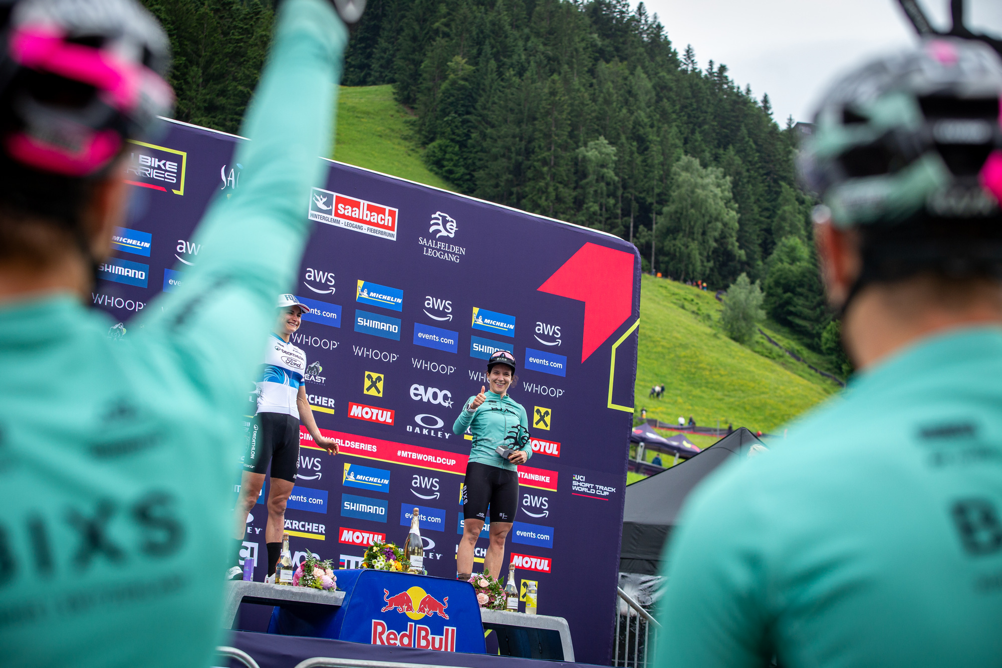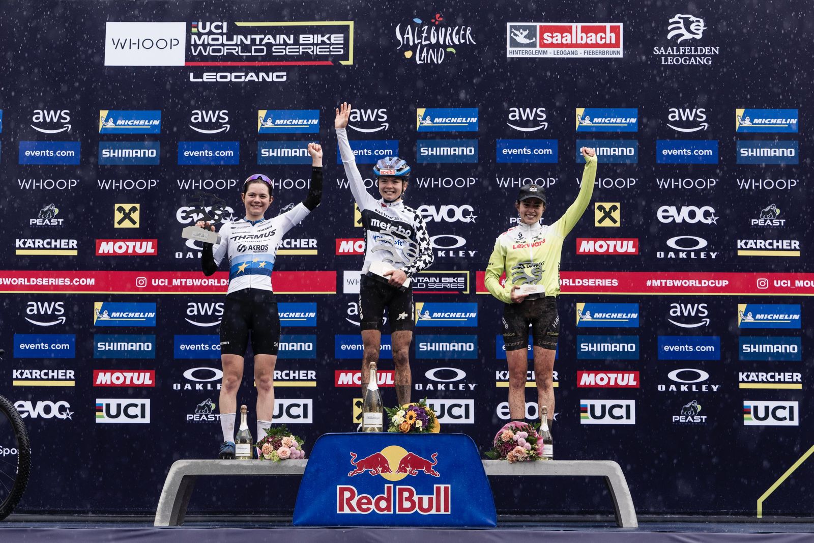 Mezi ženami naprosto suverénně zvítězila Puck Pieterse (NED, Alpecin-Deceuninck), která v Leogangu ovládla jak short track, tak cross-country. První tři ze šesti okruhů zajela nejrychlejší časy, v posledním jela na jistotu a vyhrála s náskokem 50 vteřin před Samarou Maxwell (NZL, Decathlon Ford). Puck tak dovezla první dvě vítězství nově představené sadě Shimano XTR, které zejména v neděli dostalo co proto.