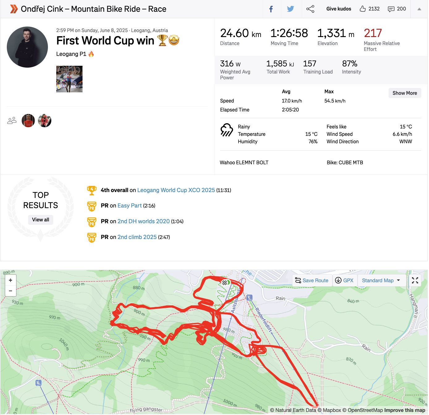 Tým Cube Factory, za který Ondřej letos jezdí, zaznamenal v Leogangu dvě vítězství. Kromě Ondry triumfoval také Švýcar Finn Treudler v kategorii U23.