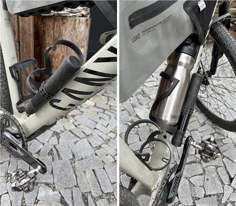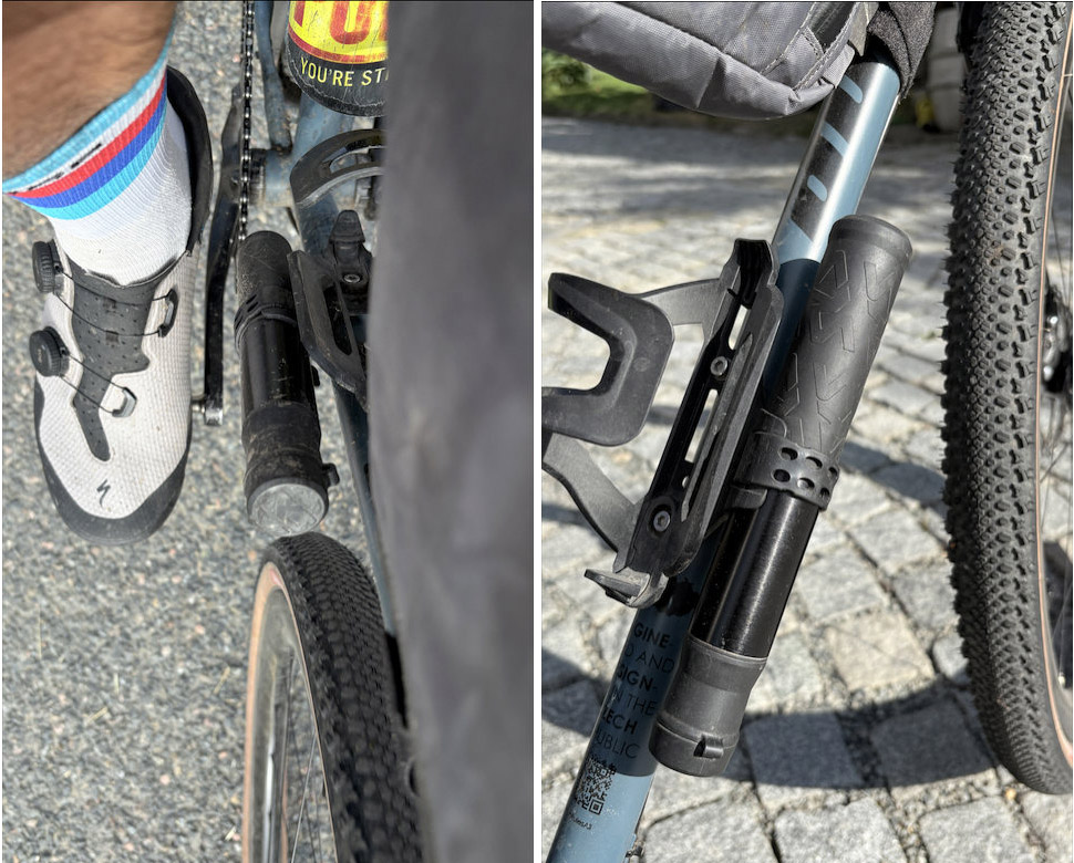 Pumpička SKS Airflex Explorer se dodává s držákem, který uchytíte pod košík bidonu, má dostatečně široké dírky, aby bylo možné nastavit vzdálenost od rámu či samotného košíku. Přeci jen jiné je připevnění na úzkém ocelovém rámu a jiné na širokém karbonu. Každopádně v obou případech byla jak montáž, tak i následné uchycení a vození pumpičky velmi dobré.