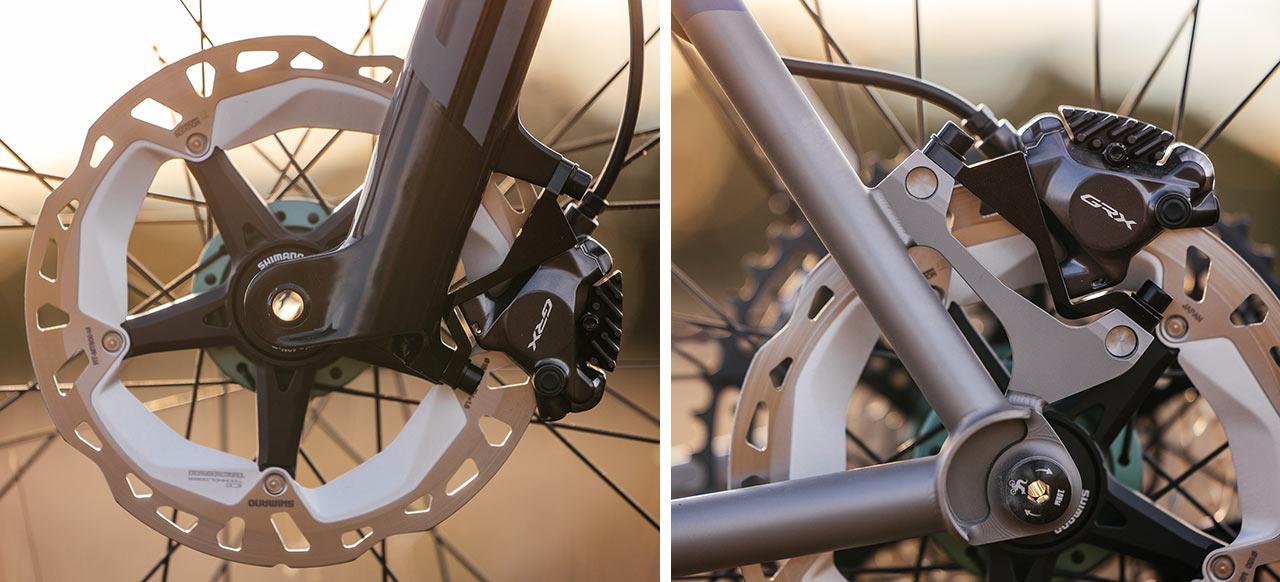 Velkým tématem je pak využití Scrambleru pro bikepacking. Rám nabízí velké množství montážních bodů – trojité úchyty pro lahve, piny na horní i spodní trubce, možnost instalace zadního nosiče i vedení pro teleskopickou sedlovku. Moots dokonce umožňuje ovládat sedlovku levou dualovou GRX pákou, která není využitá pro řazení.