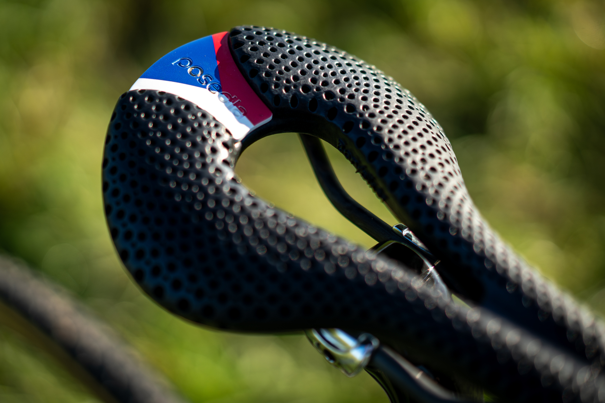 Zajímavým kouskem na kole českého šampiona je sedlo z továrny Posedla ve Varnsdorfu - na míru vyrobené pomocí 3D tisku - které je usazené na sedlovce Bontrager. Stejné značky je i představec a řídítka.