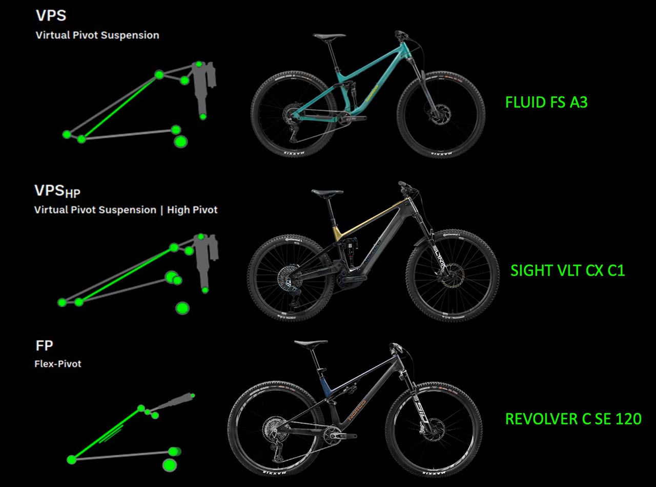 U zdvihově vyšších biků dominuje systém VPS High Pivot, tedy čtyřčepové řešení zadní stavby doplněné o vodicí kladku integrovanou do vysoko položeného hlavního čepu zadní stavby. Tento koncept zlepšuje schopnost kola žehlit terén při vysokých rychlostech, omezuje zpětné rázy do pedálů a přináší výrazně účinnější šlapání ve výjezdech. U trailově a XC laděných modelů pak NORCO využívá klasický čtyřčepový systém VPS typu Horst Link a na nízkozdvihových XC modelech používá moderní Flex-Pivot řešení, které redukuje hmotnost a zjednodušuje konstrukci zadní stavby bez zadního čepu s přepákovaným jednočepem.