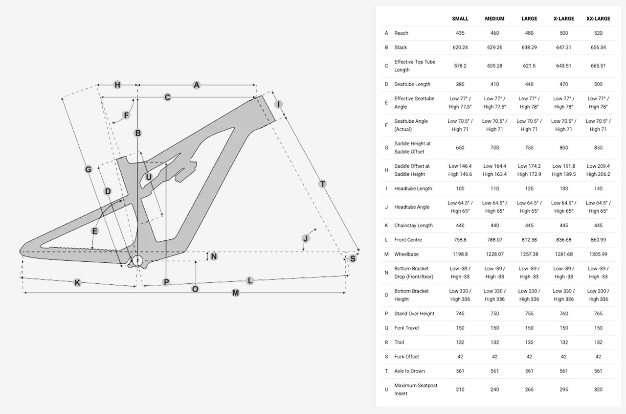 Geometrie v „low“ nastavení má hlavový úhel 64,5°, v „high“ nastavení pak 65°, efektivní sedlový úhel se pohybuje kolem 77°, v závislosti na velikosti. Reach pro velikost M je 460 mm, stack 629 mm. Délka zadních vzpěr je 440/445 mm. Střed tady najdete v klasickém BSA standardu s šířkou 73 mm, což usnadňuje servis a zajišťuje spolehlivost.