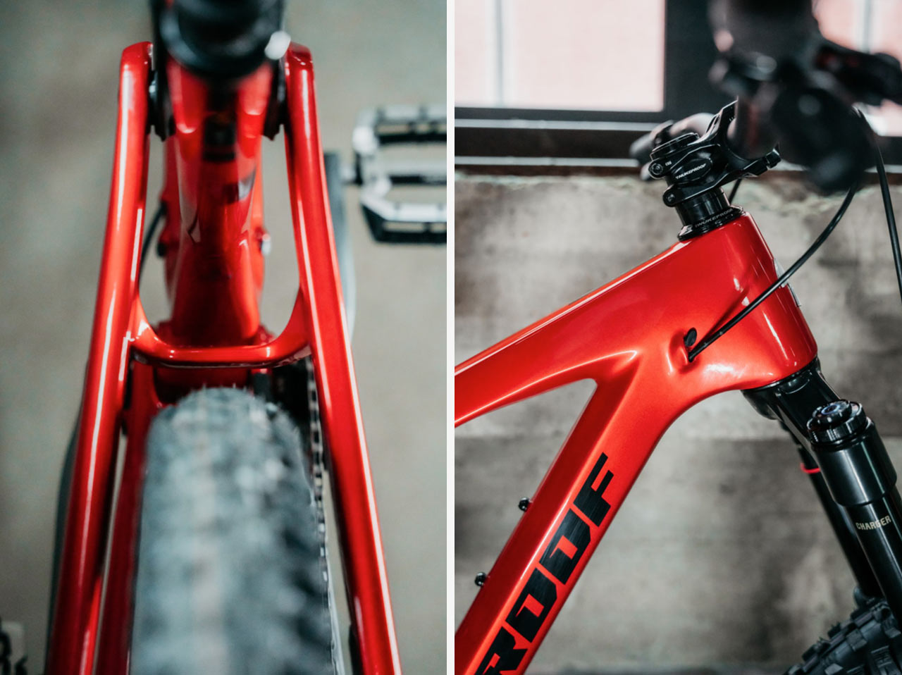 V rámci karbonového modelu jsou veškeré tvary vycizelovány v téměř umělecké dílo. Celý rám (přední i zadní trojúhelník) je monokoková konstrukce z UD karbonu. Tím Nukeproof minimalizuje váhu a maximalizuje tuhost a rám díky tomu reaguje svižně na šlapání, ale přitom zachovává komfort a výborně filtruje i malé nerovnosti. Výrobce přitom uvádí, že se mezigeneračně v rámci karbonového rámu podařilo ušetřit cca 240 g na hmotnosti, ale uvádí bohužel jen hmotnost hliníkového modelu, a to 15,17 kg.