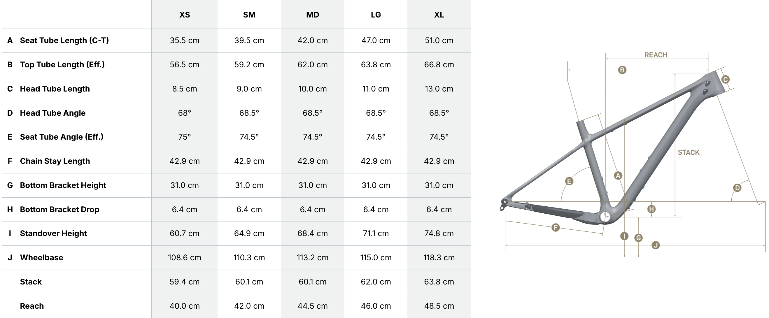 Základem zůstává stejný dutý karbonový rám jako u klasického LES SL, s udávanou hmotností pouhých 800 gramů. Geometrie odpovídá moderním XC standardům – položenější hlava, delší rozvor a velkorysá průchodnost pro pláště.