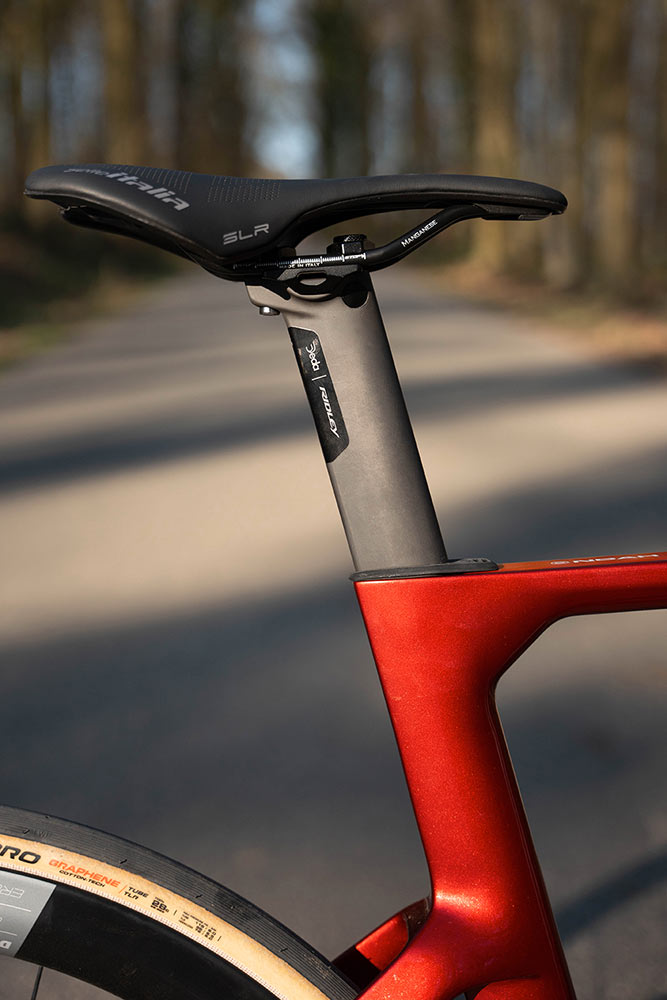Srdcem kola je ultrakompaktní jednotka TQ HPR40 s hmotností pouhých 1,2 kilogramu, doplněná baterií o hmotnosti 1,42 kilogramu a kapacitě 292 Wh. Motor je kompletně ukrytý za převodníky a baterie je subtilně integrována do aerodynamicky tvarované spodní rámové trubky. Díky tomu se Ridley podařilo zachovat typickou siluetu a aerodynamické vlastnosti modelu Noah, což je v kategorii e-road kol stále spíše výjimka než pravidlo. Celková hmotnost kola se drží pod hranicí 11 kilogramů, což z E-Noah dělá jedno z nejlehčích aero elektrokol na trhu!