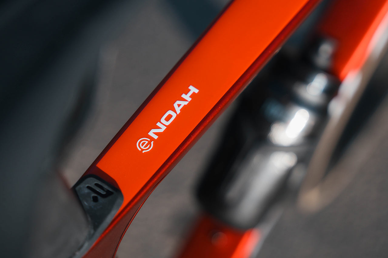 Velký důraz byl kladen i na čistotu designu. Žádné displeje, žádné výrazné ovladače ani rušivé prvky. O stavu baterie a zvoleném režimu podpory informují jen nenápadné LED diody integrované v koncovce řídítek, samotné ovládání je ukryté pod omotávkou. Na první pohled tak E-Noah působí jako klasické silniční kolo a i zkušený cyklista si elektrickou podporu všimne až při bližším zkoumání.