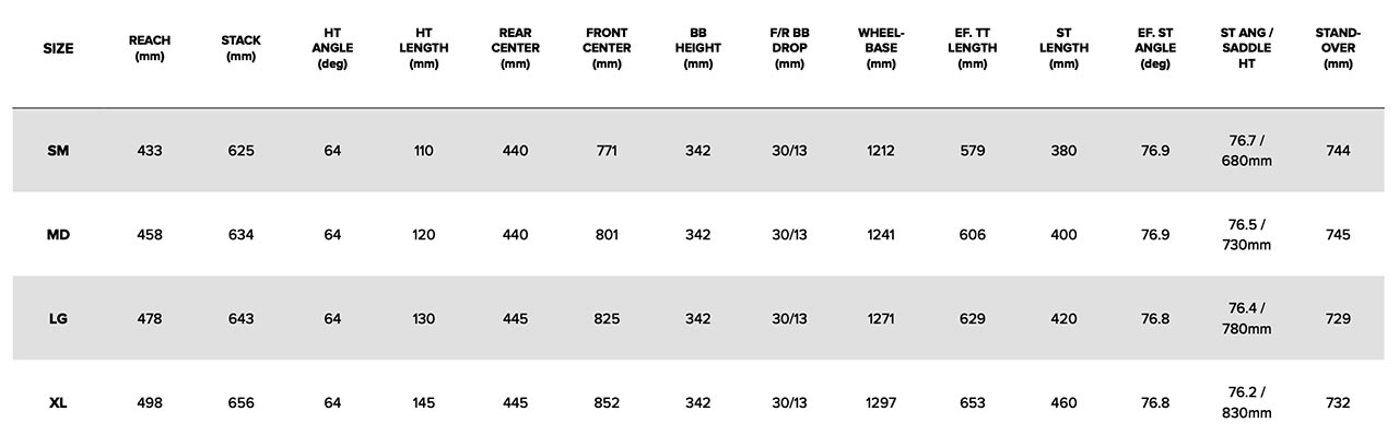 Geometrie hliníkové verze přesně kopíruje tu karbonovou a představuje ideální kompromis pro všestranné trailové ježdění. Při pohledu na konkrétní hodnoty u velikosti L je zřejmé zaměření na moderní pojetí jízdy. Hlavový úhel má hodnotu 64°, což slibuje velkou jistotu ve sjezdech a stabilitu ve vysokých rychlostech. K efektivnímu šlapání a zdolávání prudkých stoupání přispívá efektivní sedlový úhel 76,8°. Reach nabídne 478 mm a Stack 643 mm, což jen potvrzuje potvrzuje moderní střih biku, který poskytuje jezdci dostatek prostoru pro aktivní práci s těžištěm v technických pasážích.