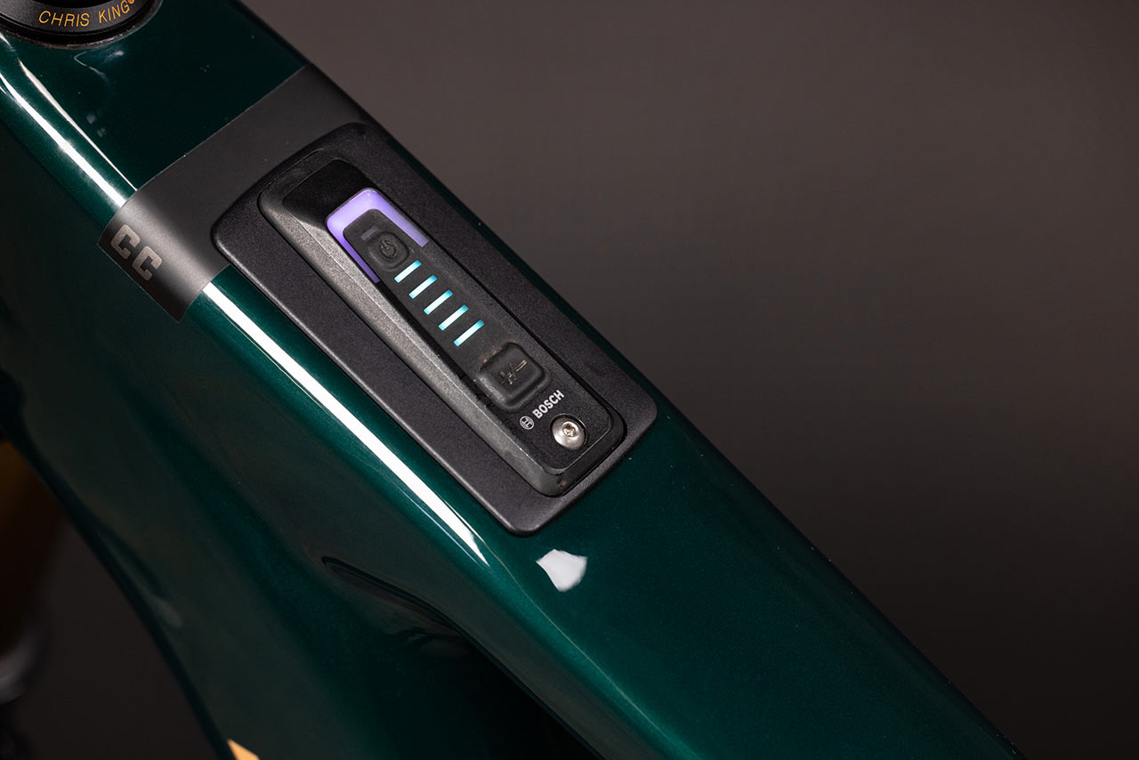 V rámci horní rámové trubky najdete kousek za představcem prostor pro integrovaný Bosch modul ovládání pohonu, do kterého bude v budoucnu možné umístit i další LCD komponenty. Spodní rámová trubka naopak zůstala maximálně kompaktní. Baterie se do ní nasouvá zespodu, ale před tím je potřeba kompletně demontovat motor, takže má baterie charakter uživatelsky nevyjímatelné s tím, že nabíjení probíhá díky konektoru umístěnému dole na levé straně spodní rámové trubky.