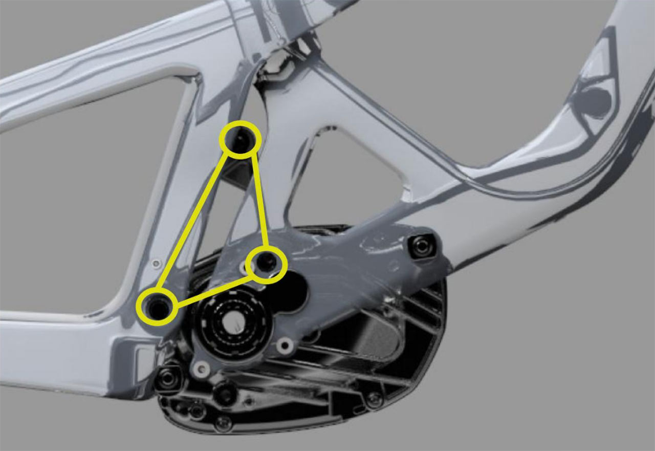 Ale pojďme zpět k ebiku Vala. Tady konstruktéři totiž narazili na problém velikosti motoru a jeho tvarových dispozic, které jim jednoduše neumožnily skloubit virtuální VPP zavěšení s tímto typem pohonu. Dobře to ilustruje následující grafika, v rámci které je vidět kde by se mělo nacházet spodní vahadlo zavěšení systému VPP a kam až zasahuje tělo pohonu Bosch.