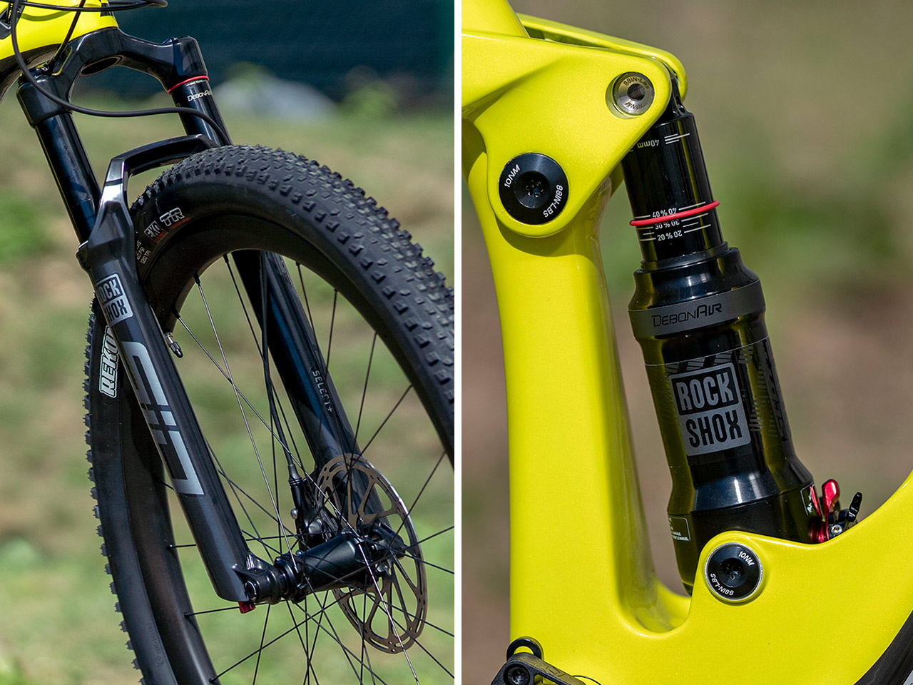 Ohledně odpružení můžeme pokračovat v inovativním posunu, protože Scott, jak již bylo řečeno, přidal 10 mm na předním zdvihu a jako prostředníka k tomu samozřejmě použil závodní model Rock Shox SID Select+ RL3. Vzadu pak zůstává jeho vlastní tlumič Nude RL3, který v kombinaci se speciální TwinLoc páčkou umožňuje snadnou změnu v rámci tří poloh, které nabídnou buď zdvih 100 mm, nebo redukovanou výjezdovou variantu 70 mm nebo totální lockout.