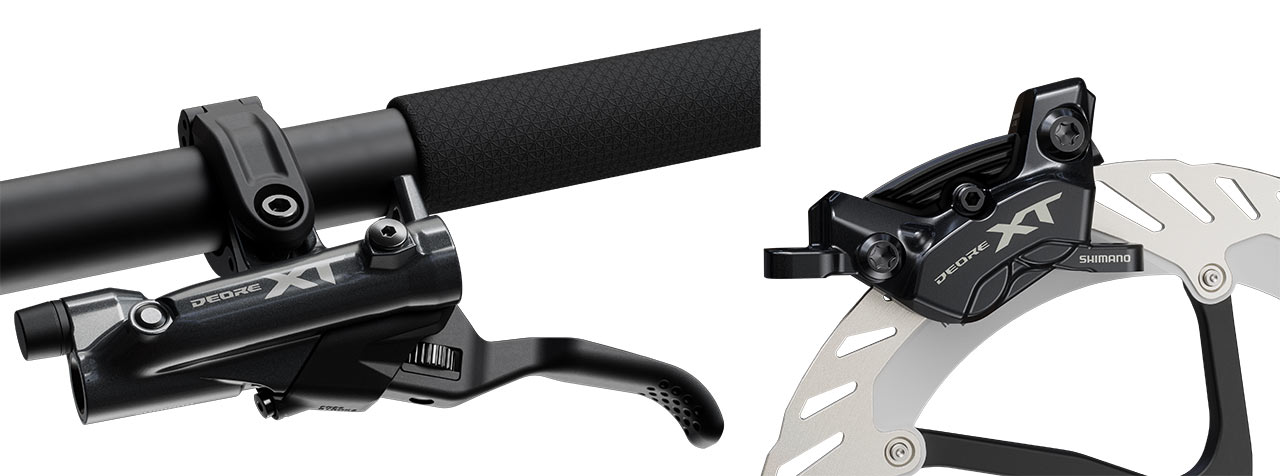 XT přešlo, stejně jako XTR, na nový brzdový olej LV, který lépe funguje v širším rozsahu teplot díky jeho nižší viskozitě. Co se ovšem konstrukce brzdových třmenů týká, ty zůstávají technologicky na bázi původních dvoudílných třmenů sešroubovaných dvěma šrouby, s tím, že Shimano tvrdí, že by se to na brzdovém účinku nemělo výrazně projevit a brzdná síla by měla být na špičkové úrovni, přičemž oproti XTR zde bude samozřejmě určitý nárůst hmotnosti.