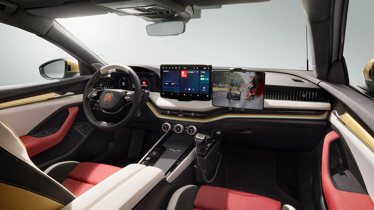 Interiér vozu je pak skutečně na maximum přizpůsoben potřebám cyklistického doprovodu. Před spolujezdcem je další displej se specializovanými daty pro řízení podpory jezdců, samozřejmostí je vysílačka pro týmovou komunikaci. Servisní technik vzadu má svůj vlastní informační displej a vedle něj umístěný chladicí box na bidony. Nezapomnělo se ani na prostor pro energetické gely nebo obvazy – ty lze uložit do stropní síťky.
