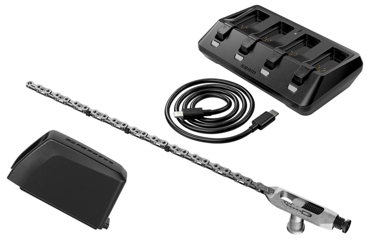 SRAM pak do této sady přibalil nejen dva převodníky (32z. a 34z.) a nástroj na jejich demontáž, ale také novou čtyřportovou USB-C nabíječku a dvojici baterií AXS, aby měl jezdec vždy případnou rezervu.