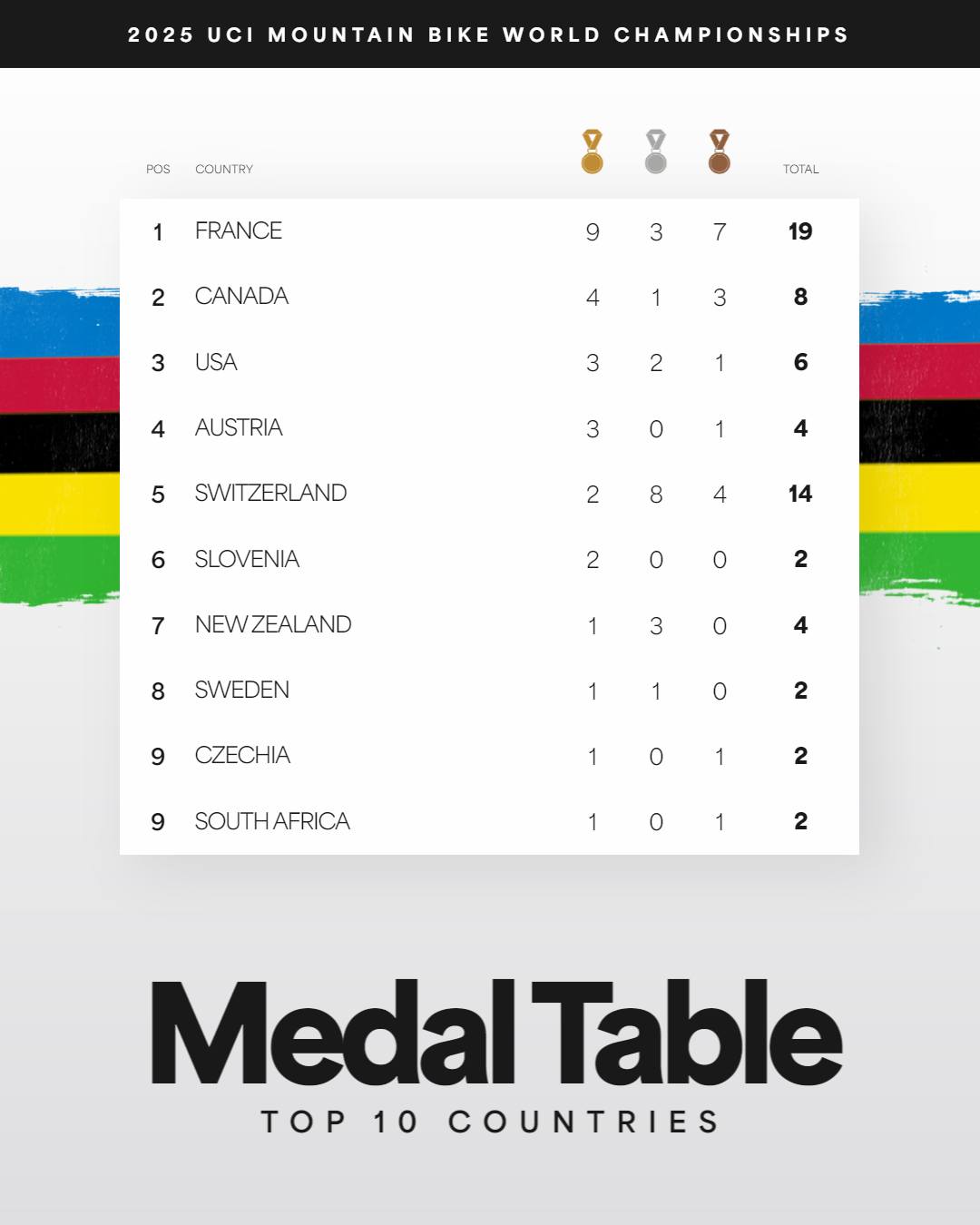 Připočteme-li k tomu i ostatní disciplíny, jako sjezd, ebiky a pochopitelně i pumtrack, Francie stále zůstává na čele tabulky, česko je s jedním titulem - Sabina Košárková / pumptrack a bronzem Bukovské v XCO - na 9. místě.
