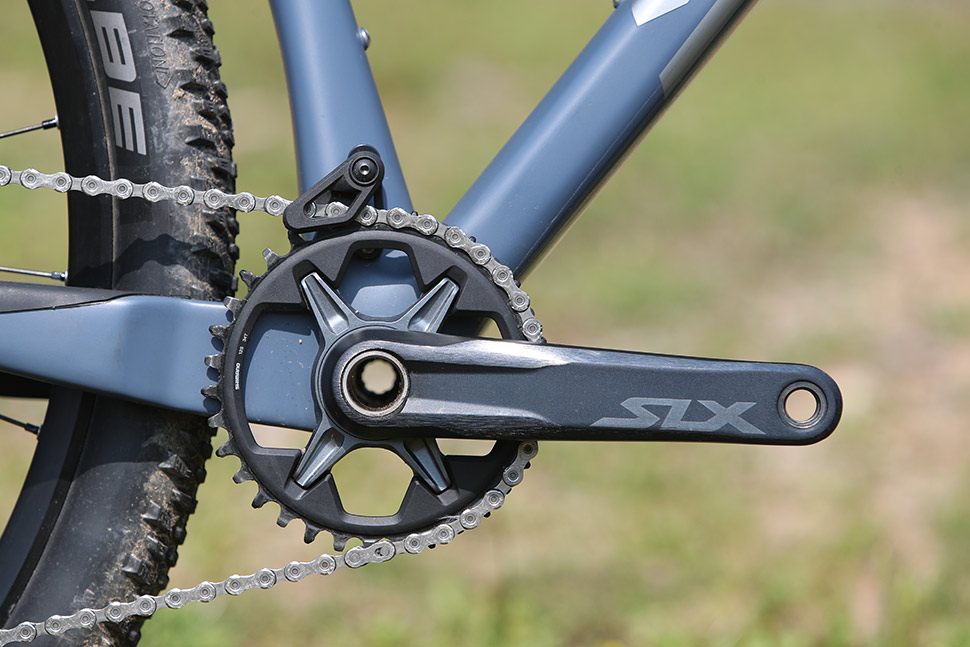 Tady je pohon sestavený z kompletní sady Shimano SLX včetně Hollowtech II klik s 34 zubovou jednoplackou a dvanáctkovou SLX kazetou 10-51z., kterou poznáte podle jediného černého převodníku.